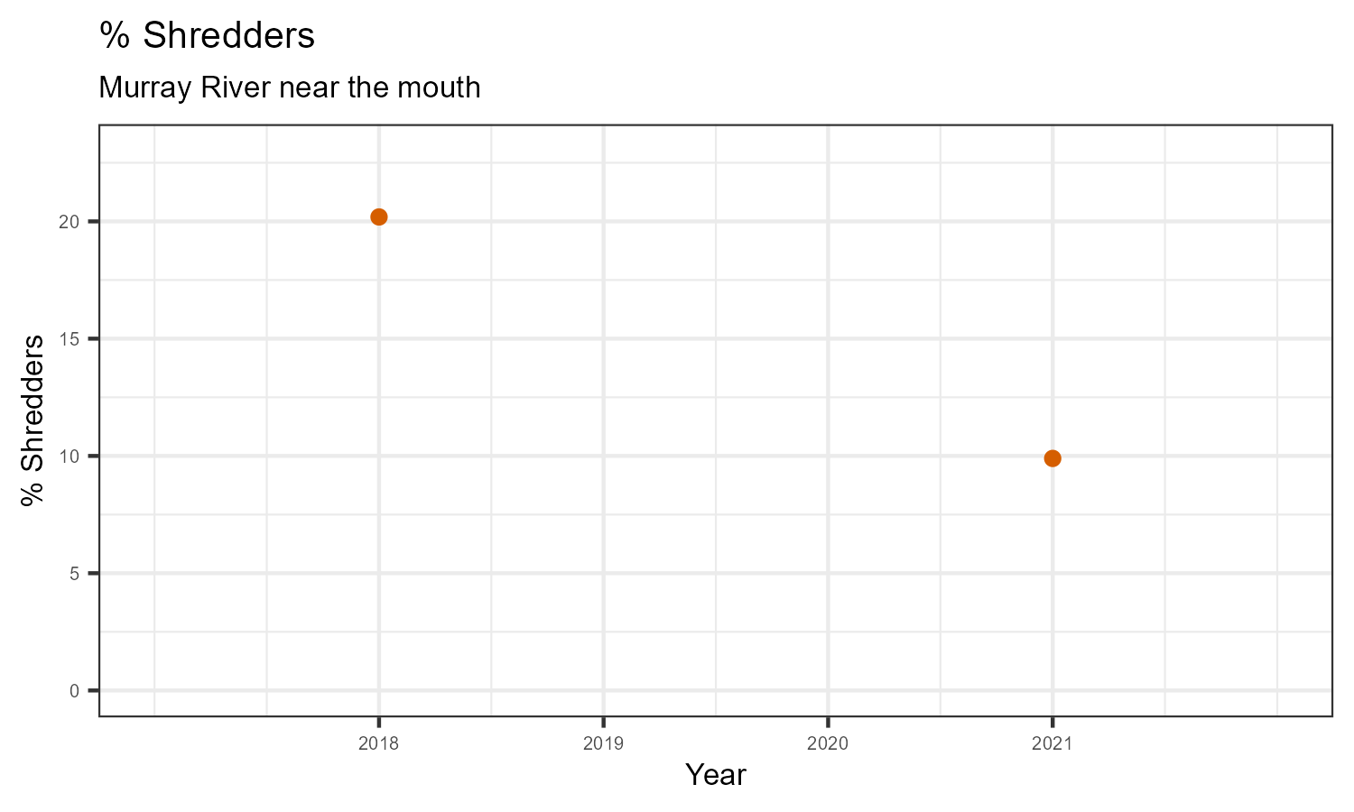 % Shredders is the proportion of taxonomic familes present that feed on leaf litter and other coarse particulate organic matter in the water. The proportion of shredders is expected to decrease at a site in response to disturbance.