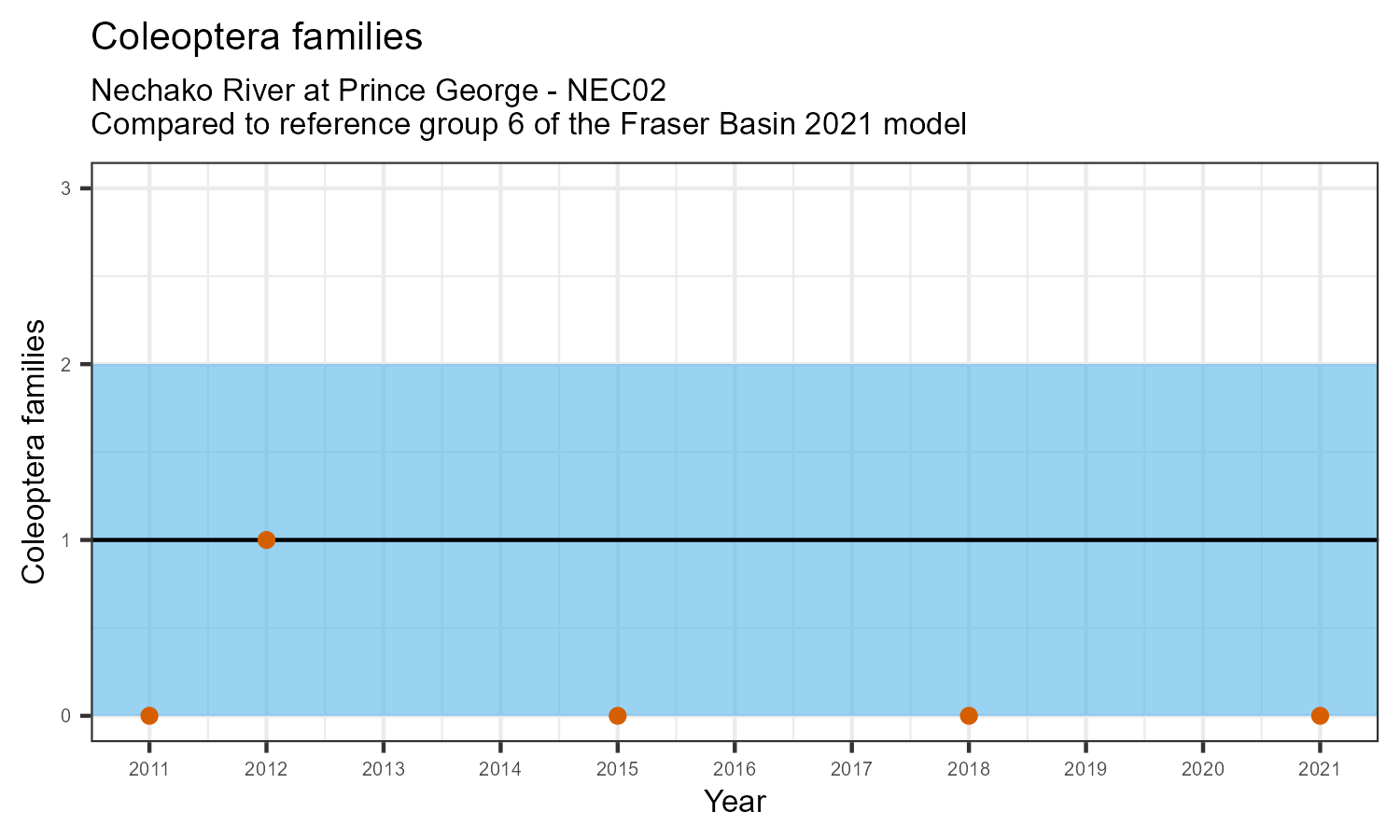 Coleoptera family richness is measured by counting how many taxonomic families belong to the order Coleoptera. Coleoptera are commonly known as beetles, many of which are aquatic or semi-aquatic. They are pollution sensitive, so Coleoptera family richness may decrease in response to habitat disturbances like poor water quality.