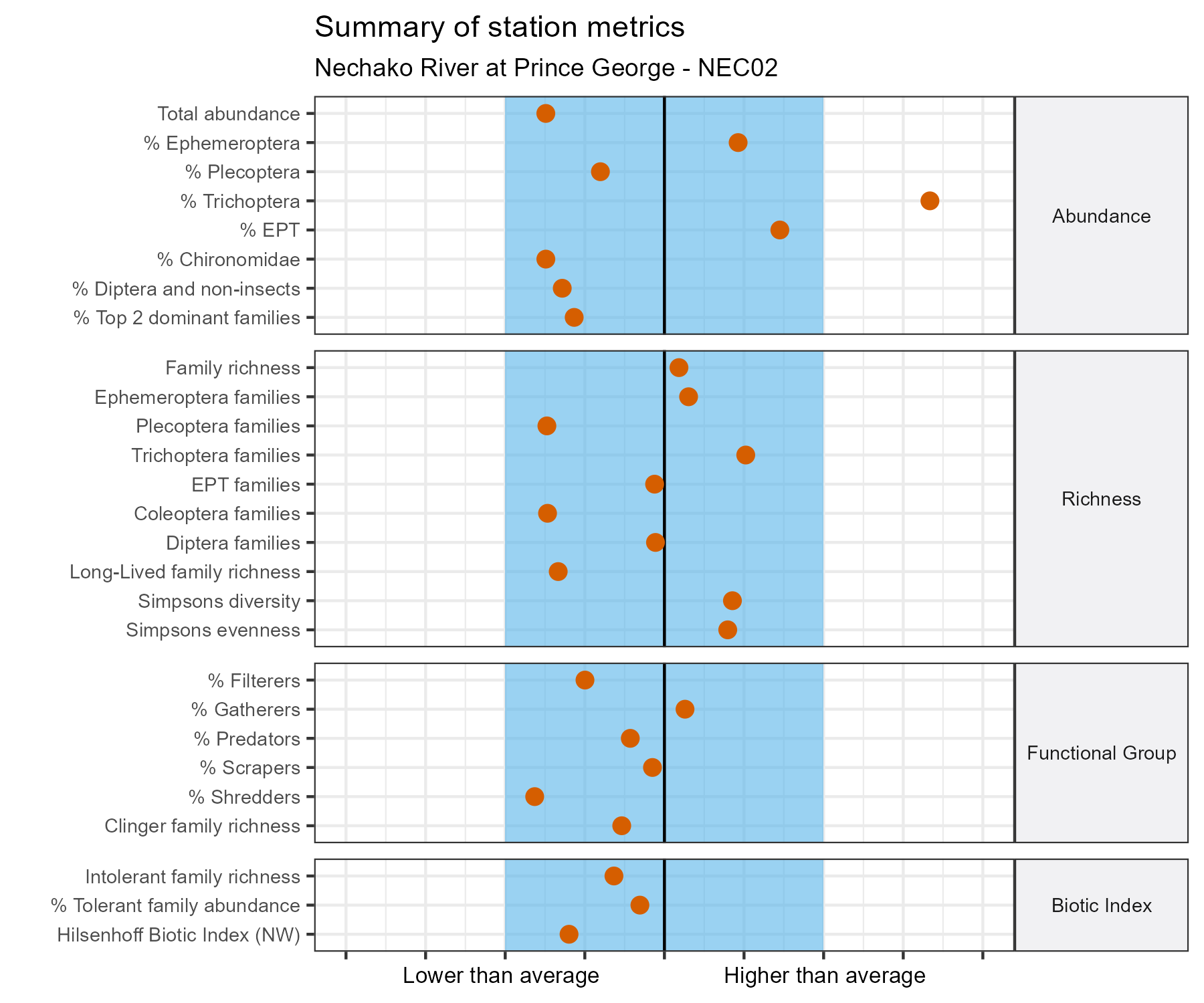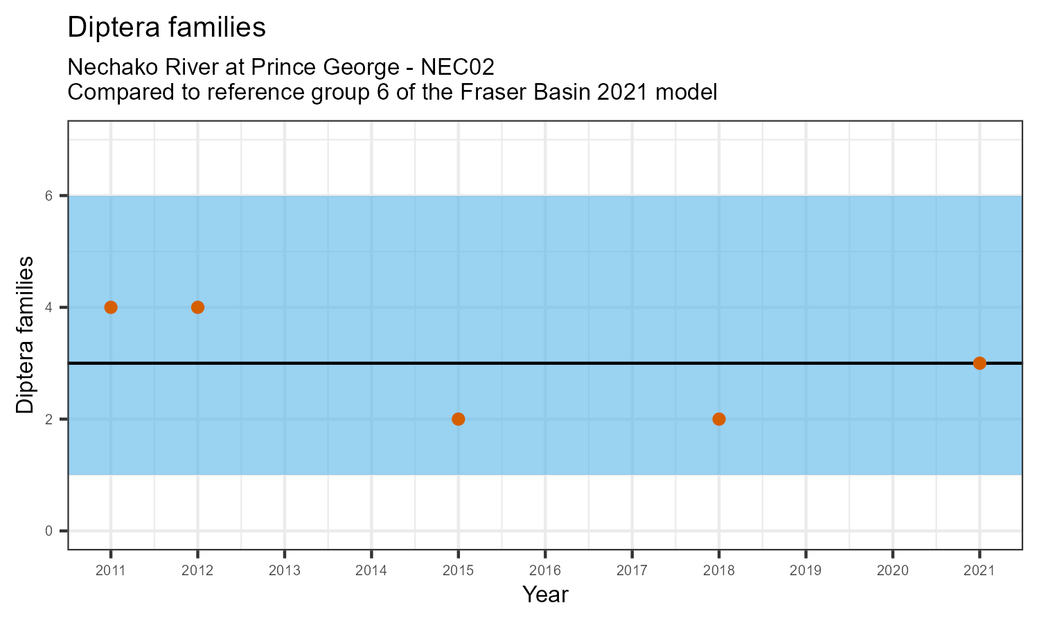 For each metric shown in the graph, the value at this station has been standarized by the standard deviation of the values from the relevant reference model group (in this case, Group 6 of the Fraser Basin 2021 reference model). The black line represents the mean value for that metric in the reference group. The blue bar represents two standard deviations of the reference group above and below the mean.