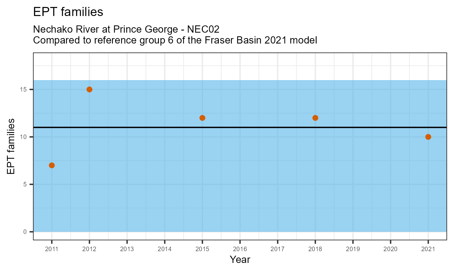 EPT family richness is measured by counting how many taxonomic families belong to one of the pollution sensitive EPT orders: Ephemeroptera (mayflies), Plecoptera (stoneflies), or Trichoptera (caddisflies). EPT family richness may decrease in response to habitat disturbances like poor water quality.