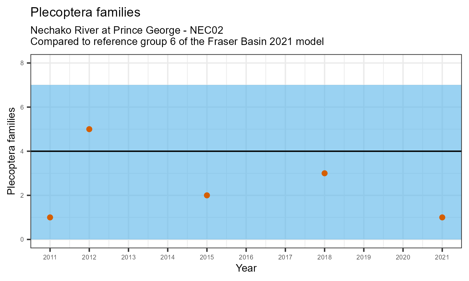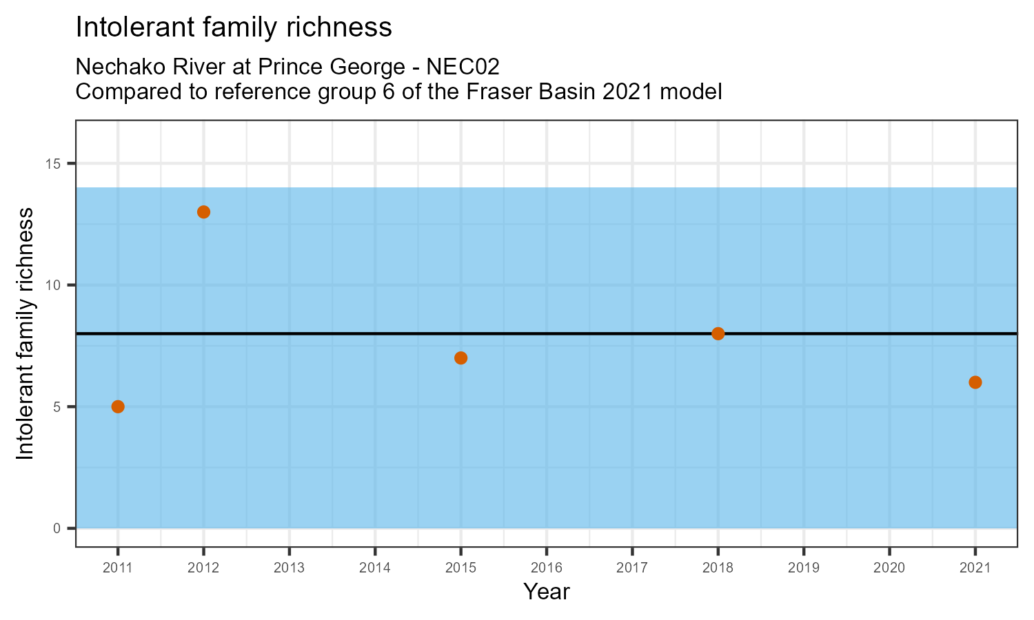 Intolerant family richness counts the number of taxonomic families that are sensitive (intolerant) to pollution, according to the Hilsenhoff Biotic Index. Intolerant family richness may decrease as water pollution increases.