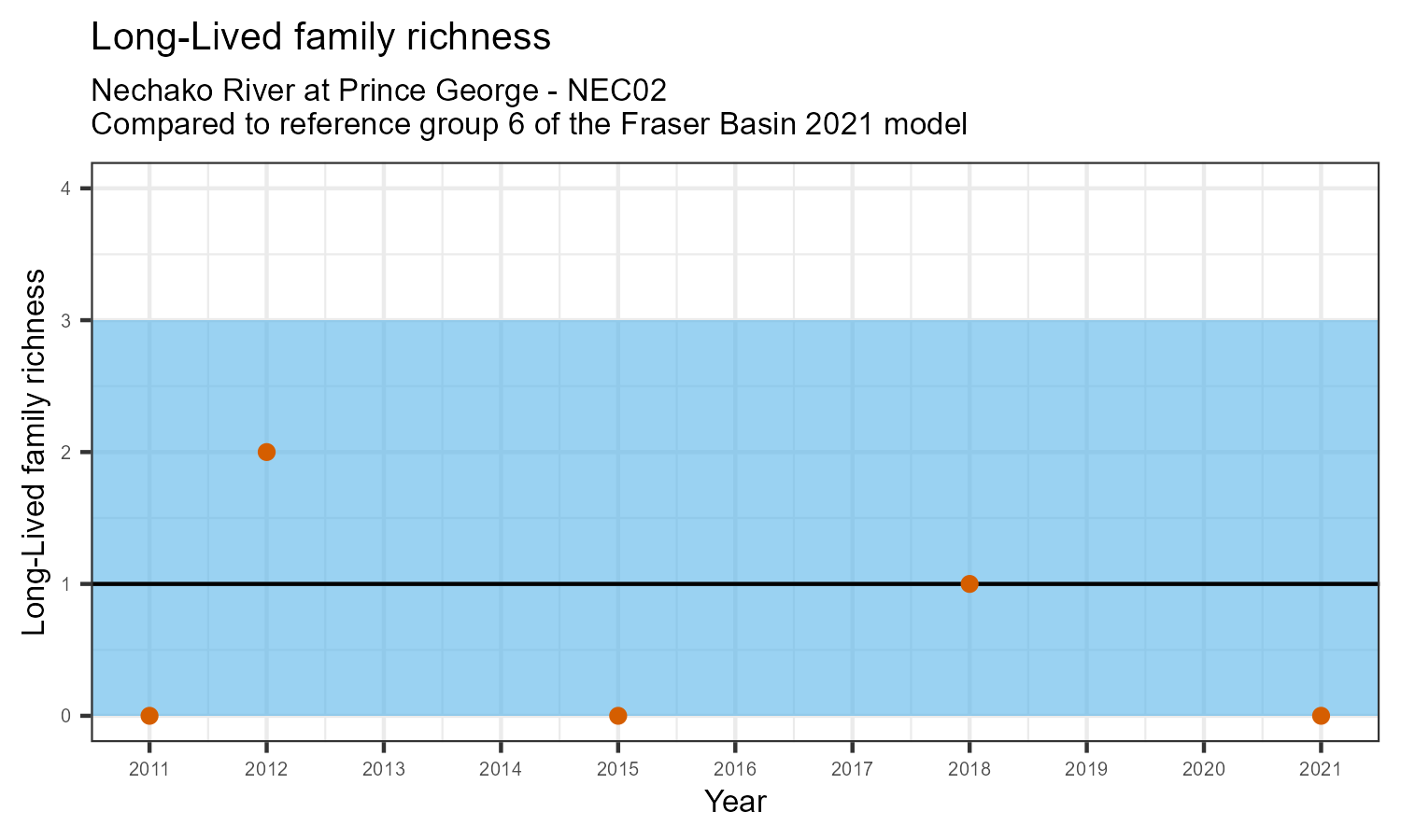 Long-lived family richness counts the number of taxonomic families that need more than 1 year to complete their life cycle. These families have been exposed to conditions in the water over a longer period. They provide information on historical and current water quality conditions. The number of long-lived families may decrease in response to habitat disturbances like poor water quality.