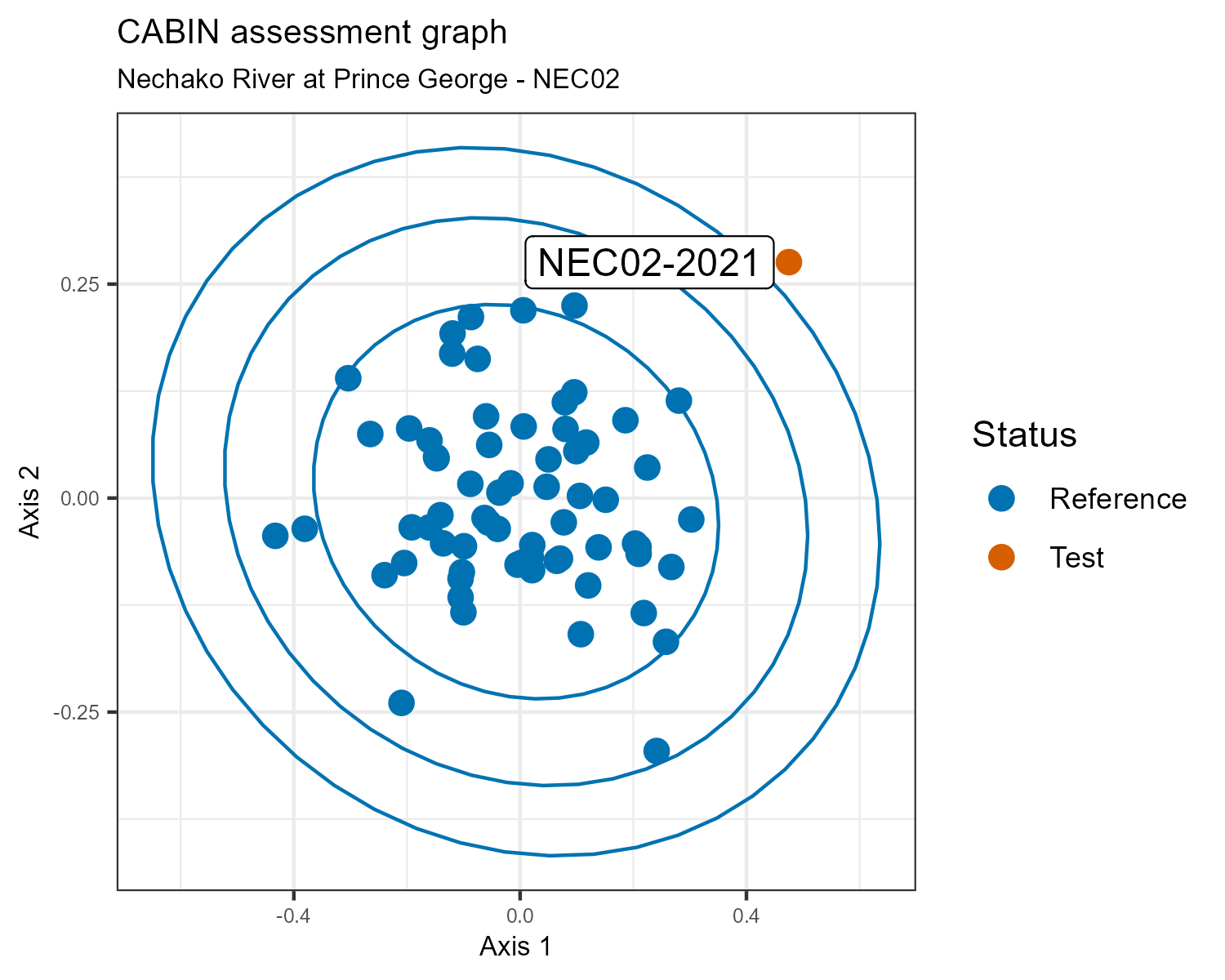 Three confidence ellipses are drawn around the group of reference sites at the 90%, 99%, and 99.9% confidence levels. The 90% ellipse is the innermost ellipse, and 90% of sites in reference condition should fall within it. The ellipses divide the plot into the four assessment categories a test site may fall into: Similar to Reference (within 90% ellipse), Mildly Divergent (90% to 99% ellipse), Divergent (99% to 99.9% ellipse), and Highly Divergent (outside the 99.9% ellipse).
