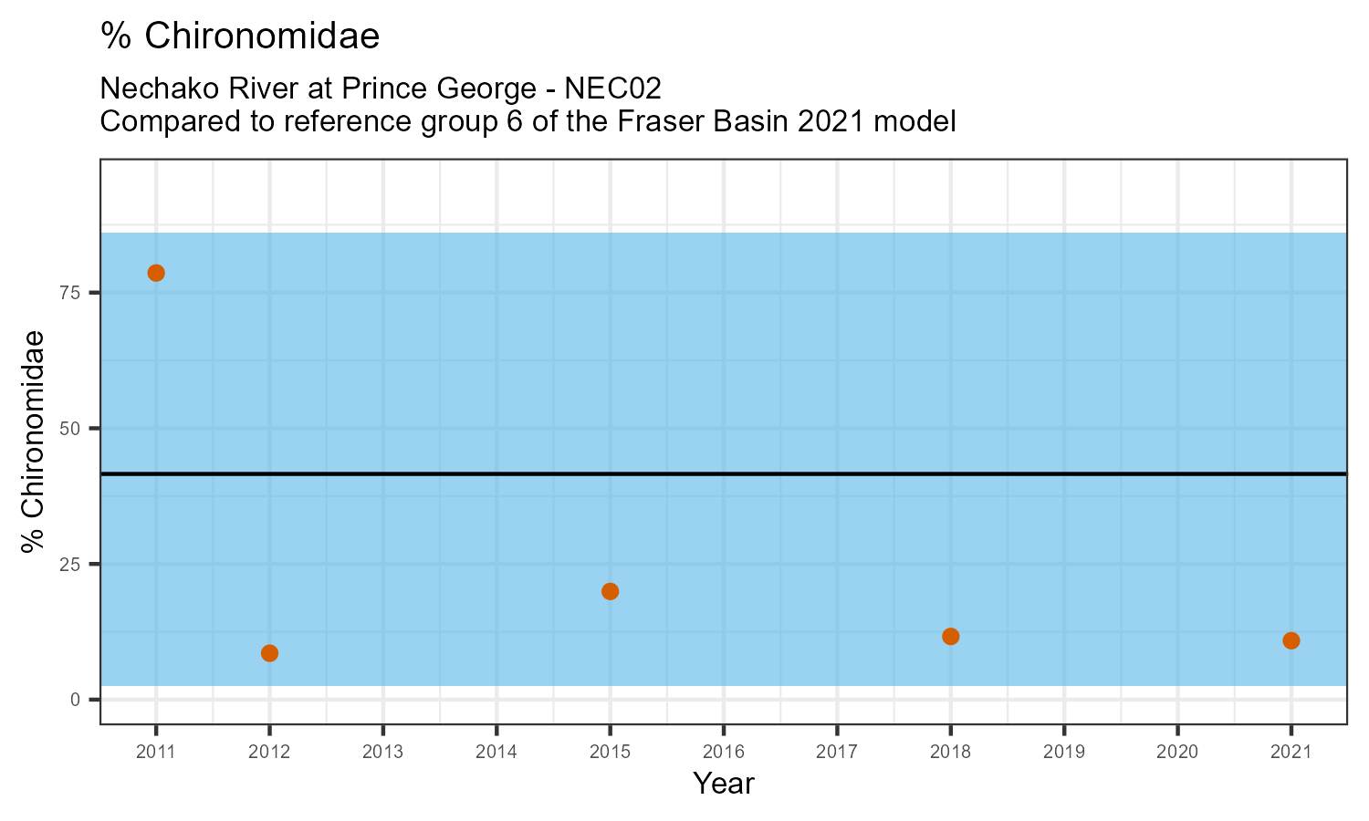 This graph shows individual metric values at this station compared to the reference group it classified to most often over all years of sampling. In this case, that is Group 6 of the Fraser Basin 2021 reference model.