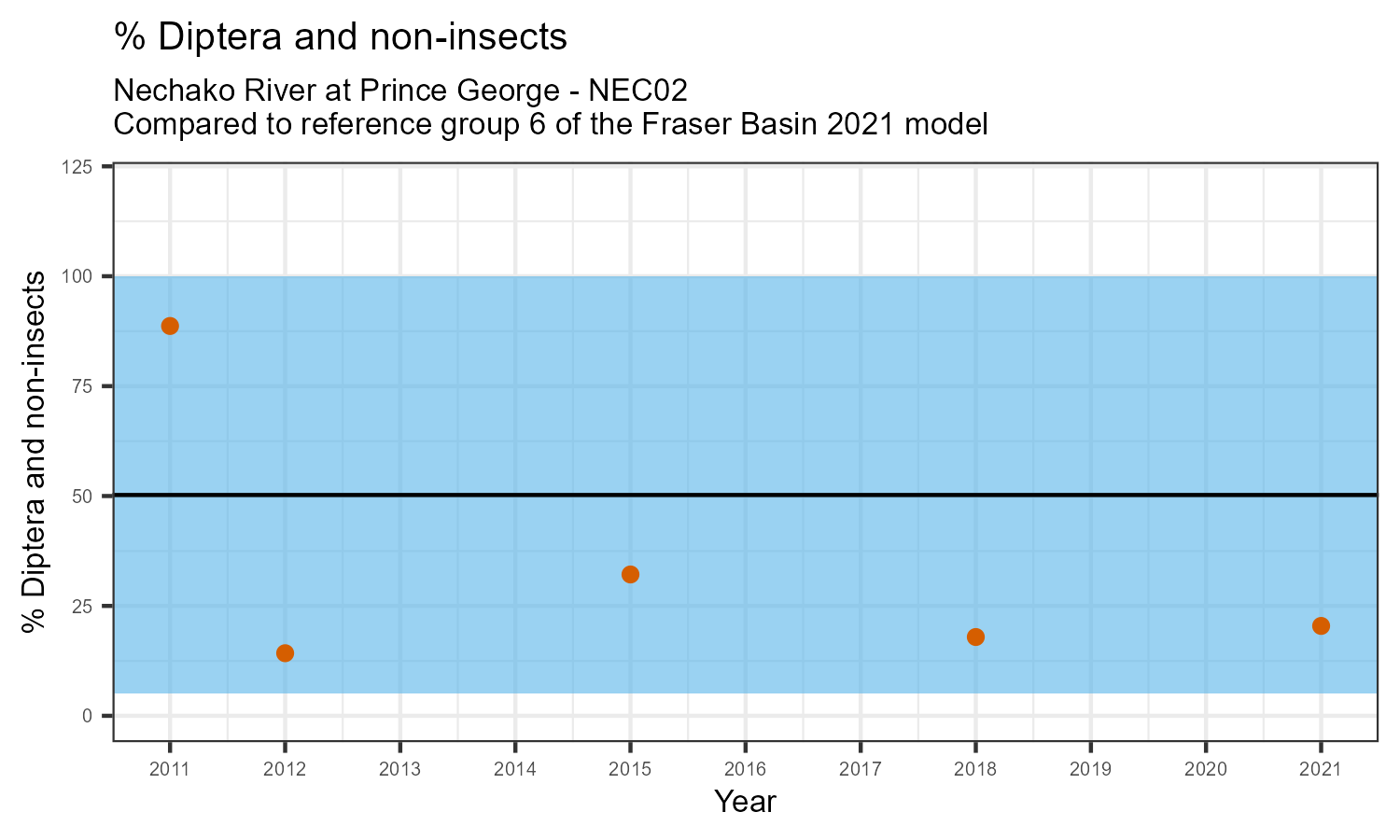% Diptera and non-insects is the proportion of invertebrates that either are not insects, or are insects in the taxonomic order Diptera. Diptera are flies, and along with non-insects they represent the more pollution tolerant members of the aquatic community. The % Diptera and non-insects may increase in response to habitat disturbances like poor water quality.