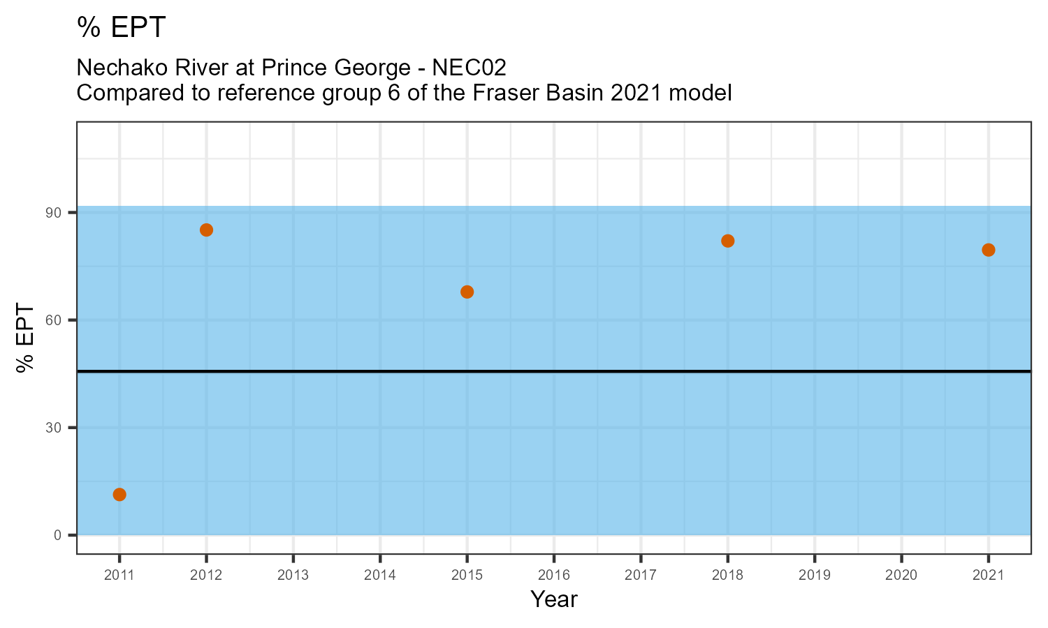 % EPT is the proportion of invertebrates that belong to one of the taxonomic orders of Ephemeroptera (mayflies), Plecoptera (stoneflies), or Trichoptera (caddisflies). These types of insects are often grouped together under the term “EPT”. They are typically the most sensitive to habitat disturbances like poor water quality.