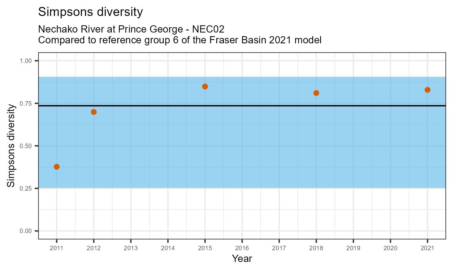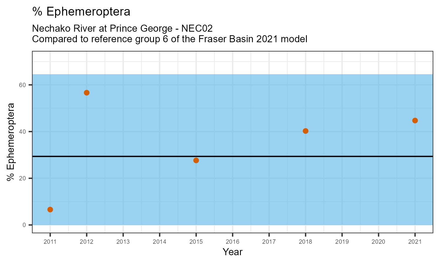 The biological condition at this station was assessed for 2021, the most recent year of sampling. The benthic macroinvertebrate community was analysed by comparing it to similar sites in a CABIN reference model for the Fraser River basin.