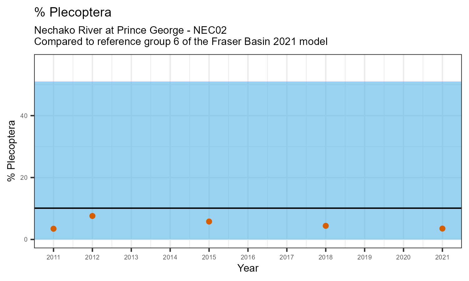 % Plecoptera is the proportion of invertebrates that belong to the taxonomic order Plecoptera. Plecoptera are commonly called stoneflies. They are sensitive to pollution. The % Plecoptera may decrease in response to habitat disturbances like poor water quality.