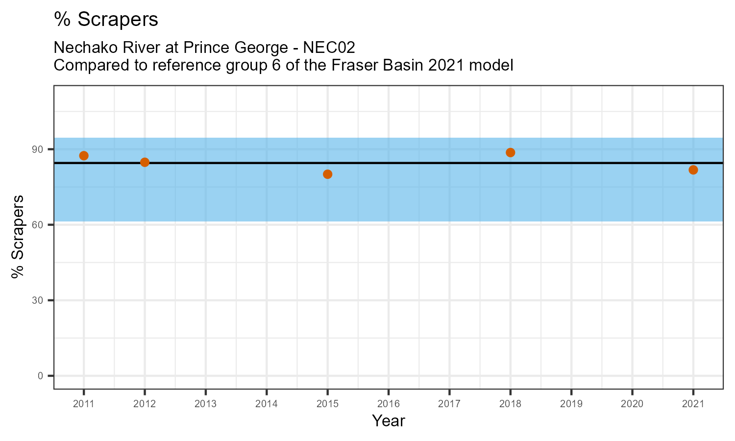 % Scrapers is the proportion of taxonomic familes present that feed by grazing on the algae growing on rocks and other underwater surfaces. The proportion of scrapers is expected to decrease at a site in response to disturbance.