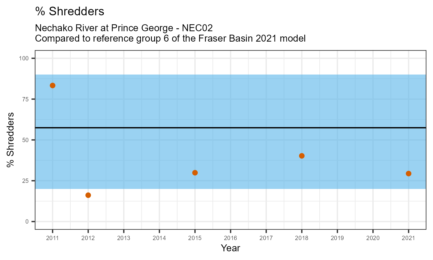 % Shredders is the proportion of taxonomic familes present that feed on leaf litter and other coarse particulate organic matter in the water. The proportion of shredders is expected to decrease at a site in response to disturbance.