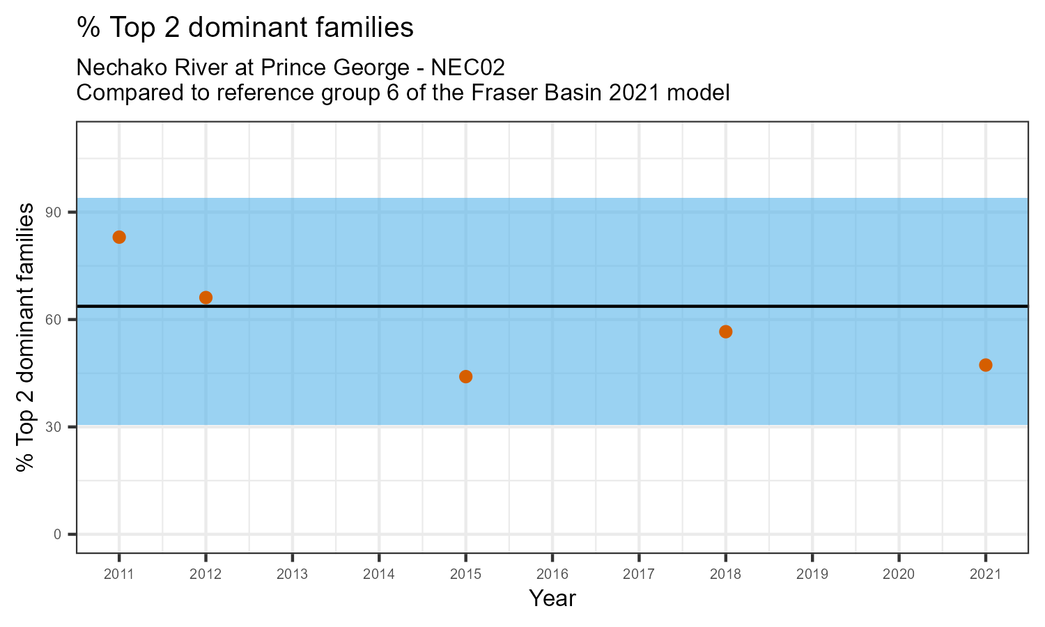 % Top 2 dominant families is the proportion of the total sample represented by the two most abundant families of invertebrates. A healthy aquatic community should have a balance of many types of invertebrates. If only one or two families dominate the community, this can be a sign of habitat disturbance. The percentage of the two most dominant families in the community may increase in response to disturbance.