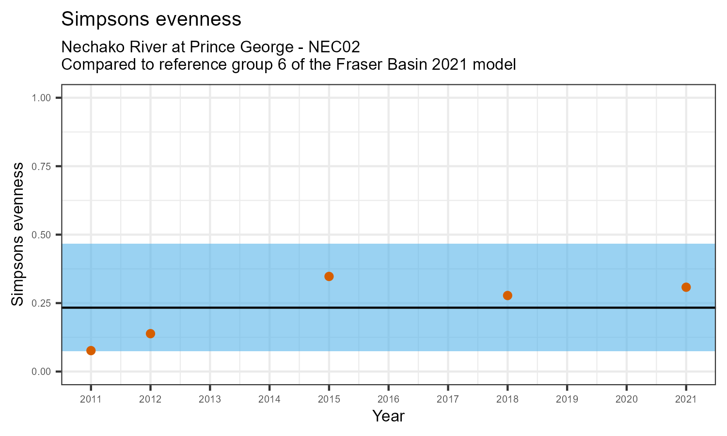 Simpson’s evenness is an index that measures whether the number of individuals in various taxonomic families is similar, or balanced. Balanced communities are an indicator of a healthy ecosystem. Simpson’s evenness may decrease in response to habitat disturbances.