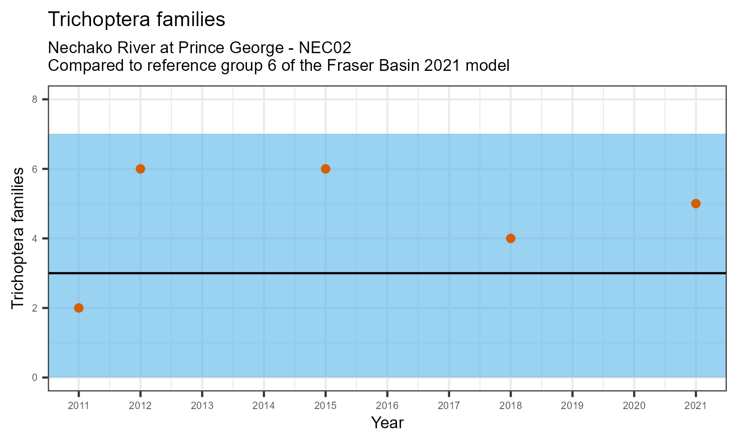 The number of families observed at this station was divided by the number of families found at more than half of similar reference sites. In 2021 the O:E ratio for this station was 0.97.