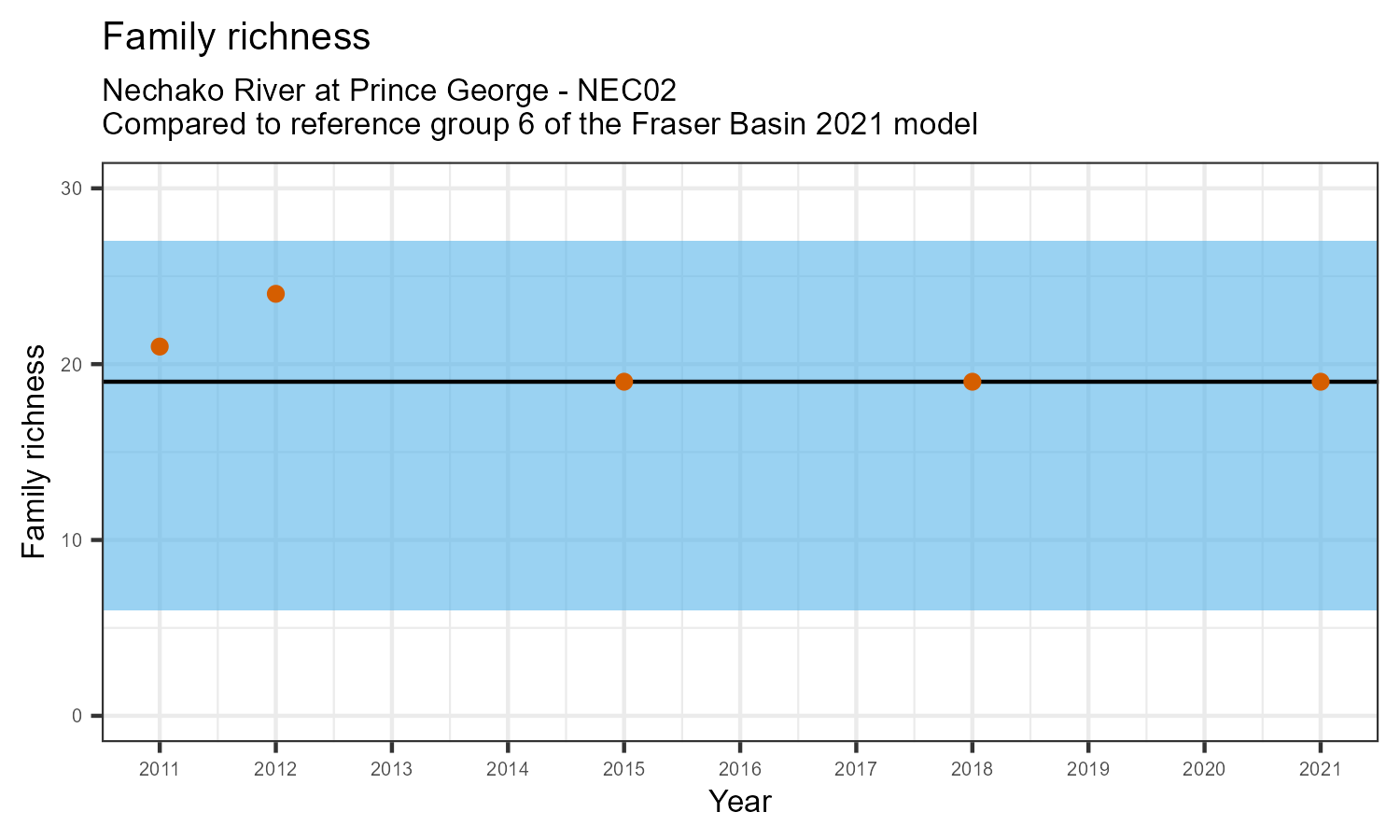 Family richness is the total number of taxonomic families identified. Family richness can decline in response to habitat disturbances or introduction of invasive species.