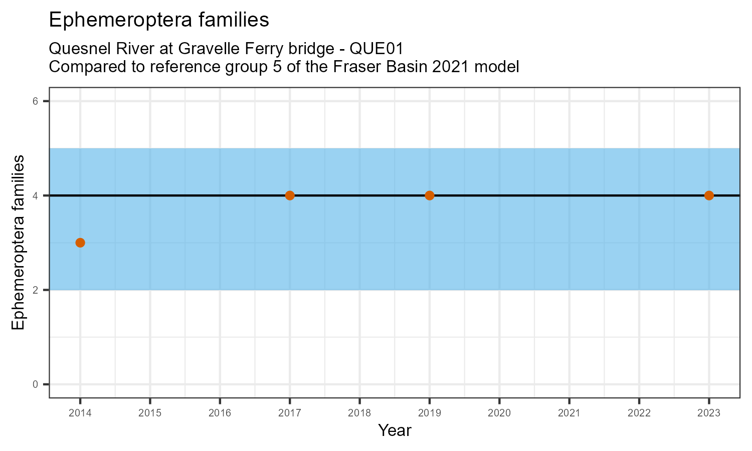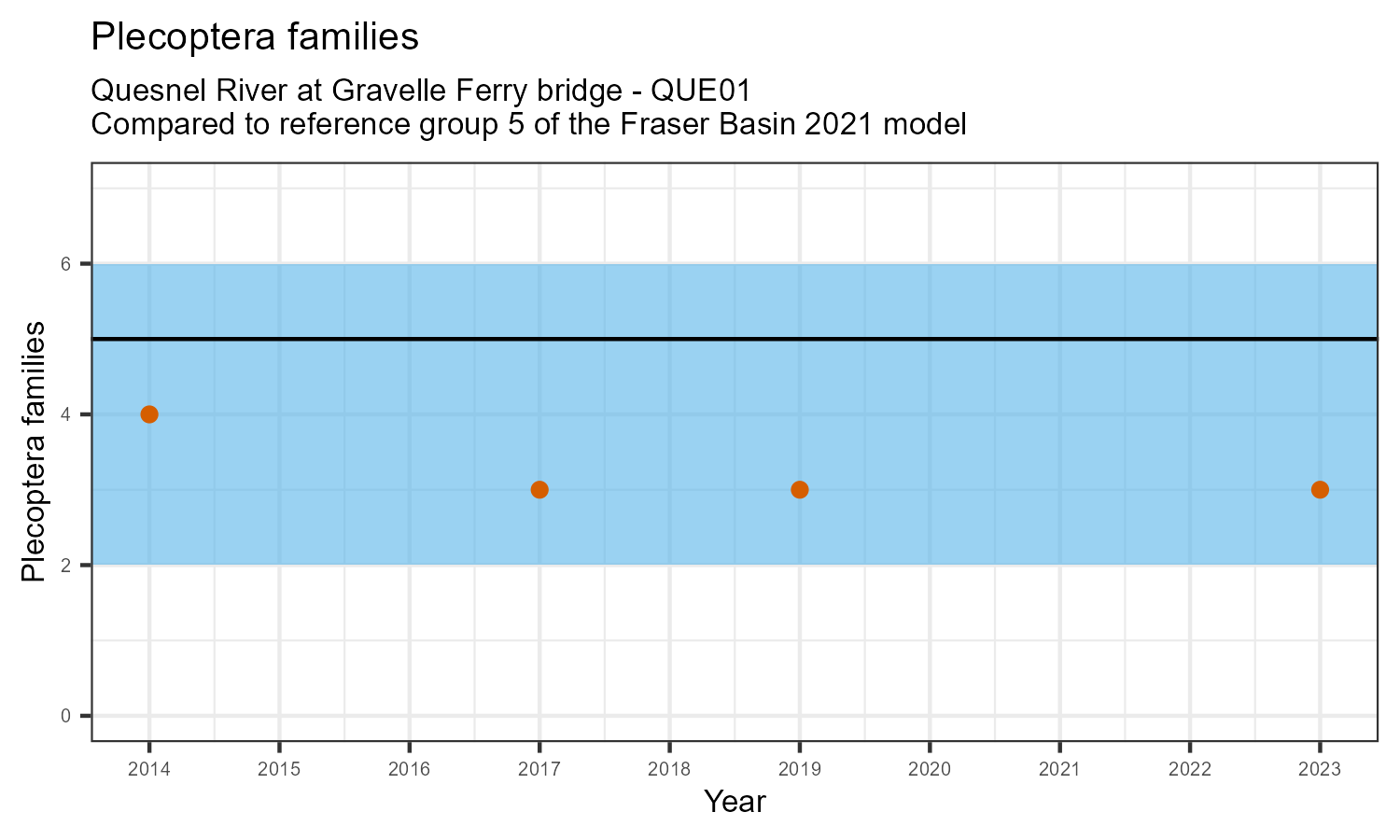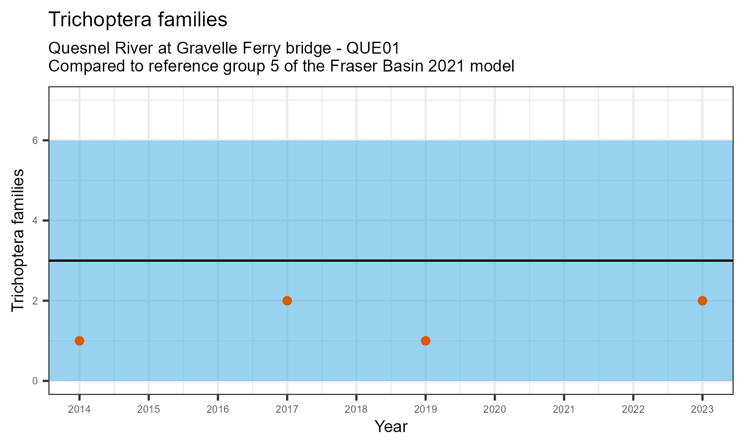 The number of families observed at this station was divided by the number of families found at more than half of similar reference sites. In 2023 the O:E ratio for this station was 0.95.