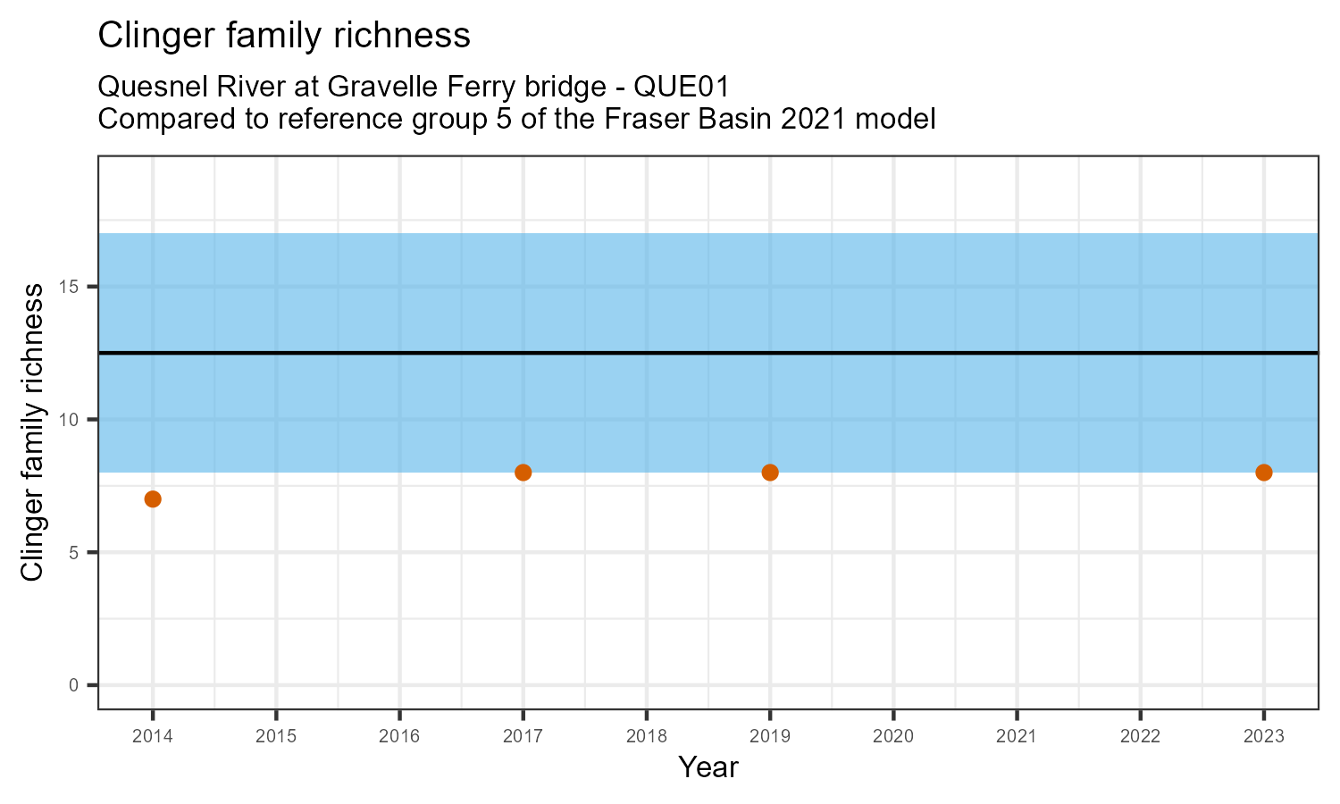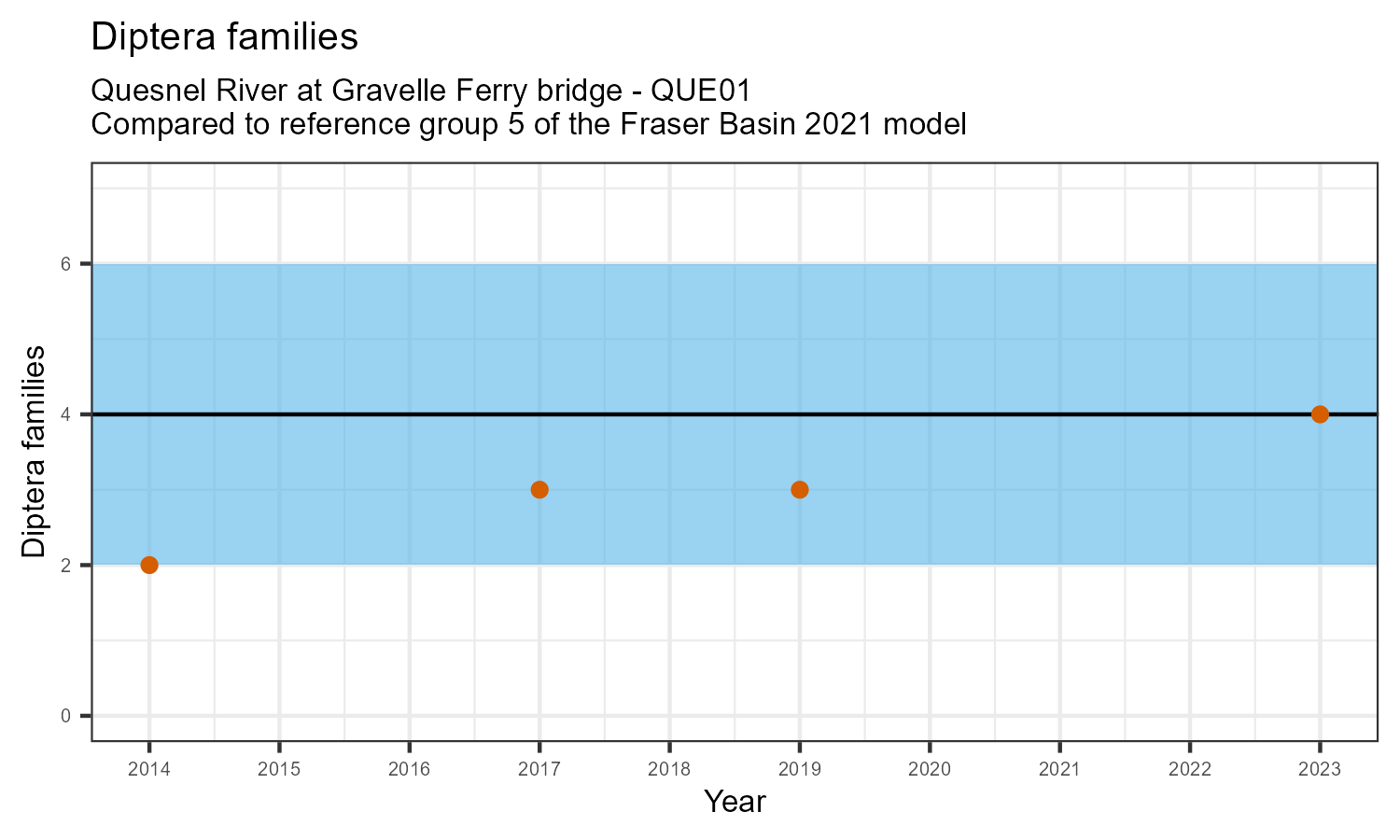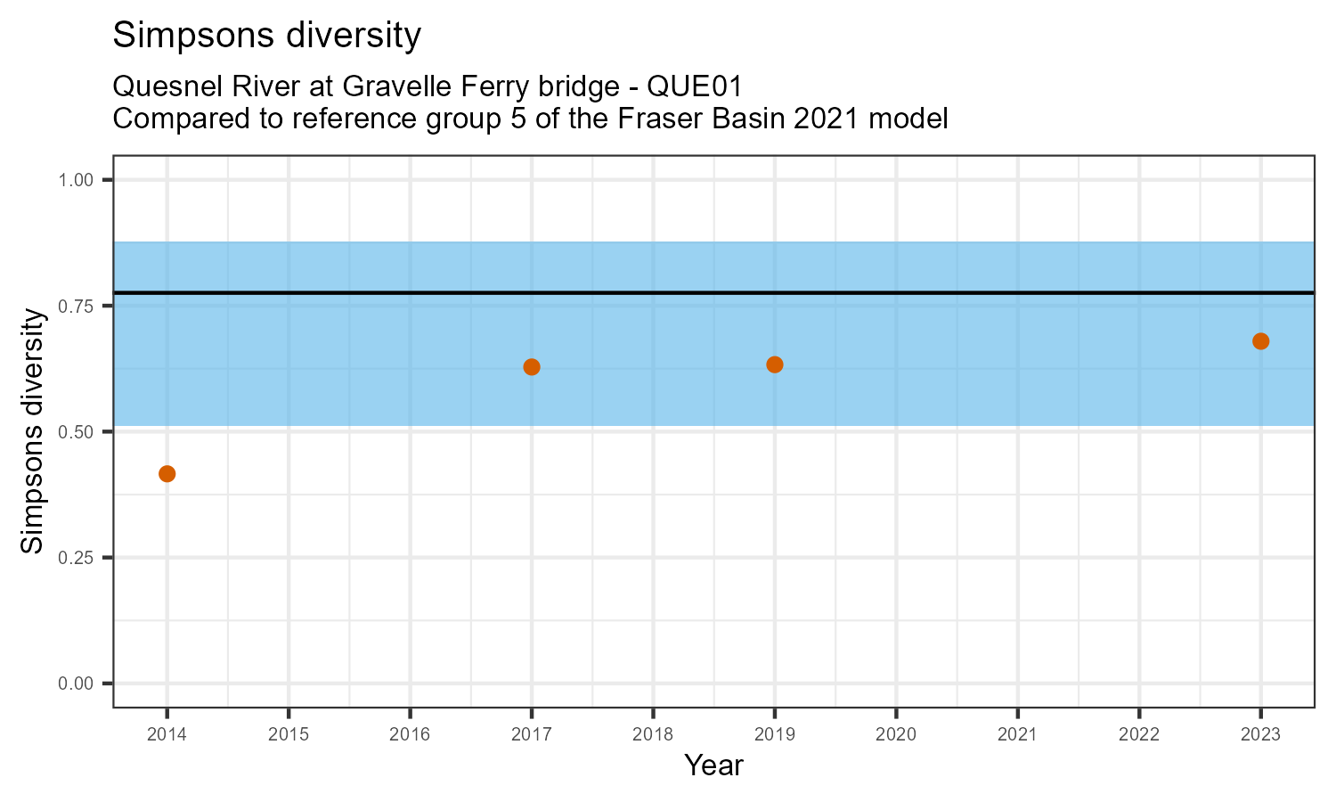 The number of families observed at this station was divided by the number of families found at more than half of similar reference sites. In 2023 the O:E ratio for this station was 0.95.