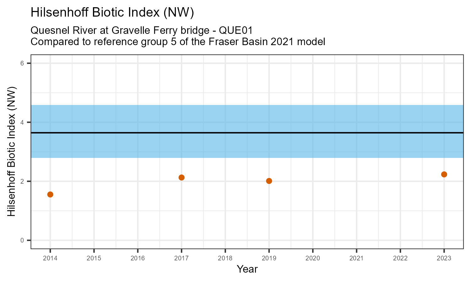 | Hilsenhoff Biotic Index (NW) | 1.55 | 2.13 | 2.01 | 2.23 | 2.79 | 3.64 | 4.58 |