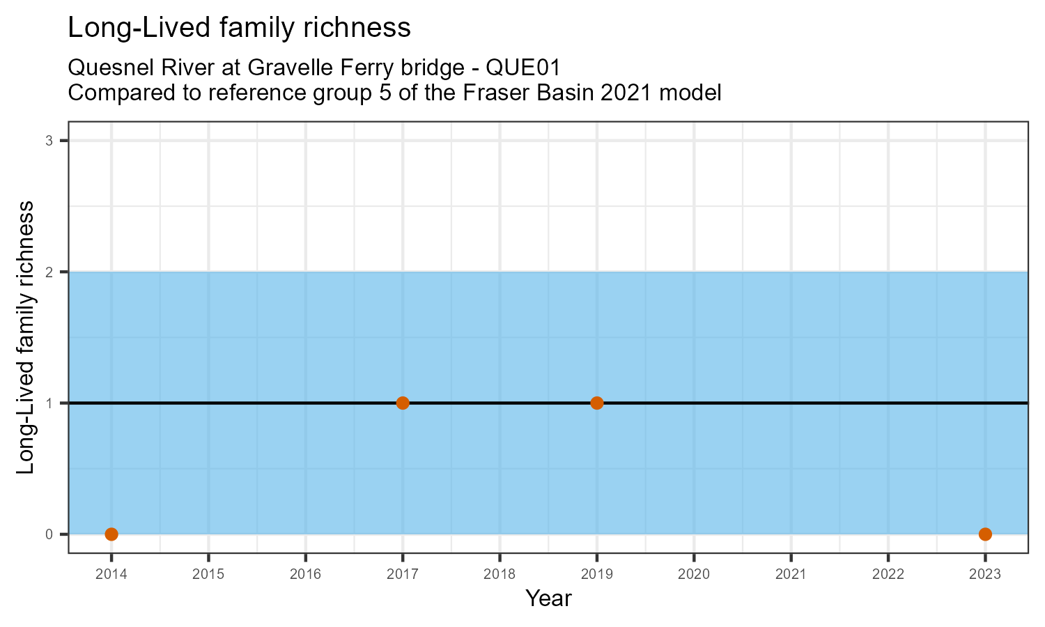 Long-lived family richness counts the number of taxonomic families that need more than 1 year to complete their life cycle. These families have been exposed to conditions in the water over a longer period. They provide information on historical and current water quality conditions. The number of long-lived families may decrease in response to habitat disturbances like poor water quality.