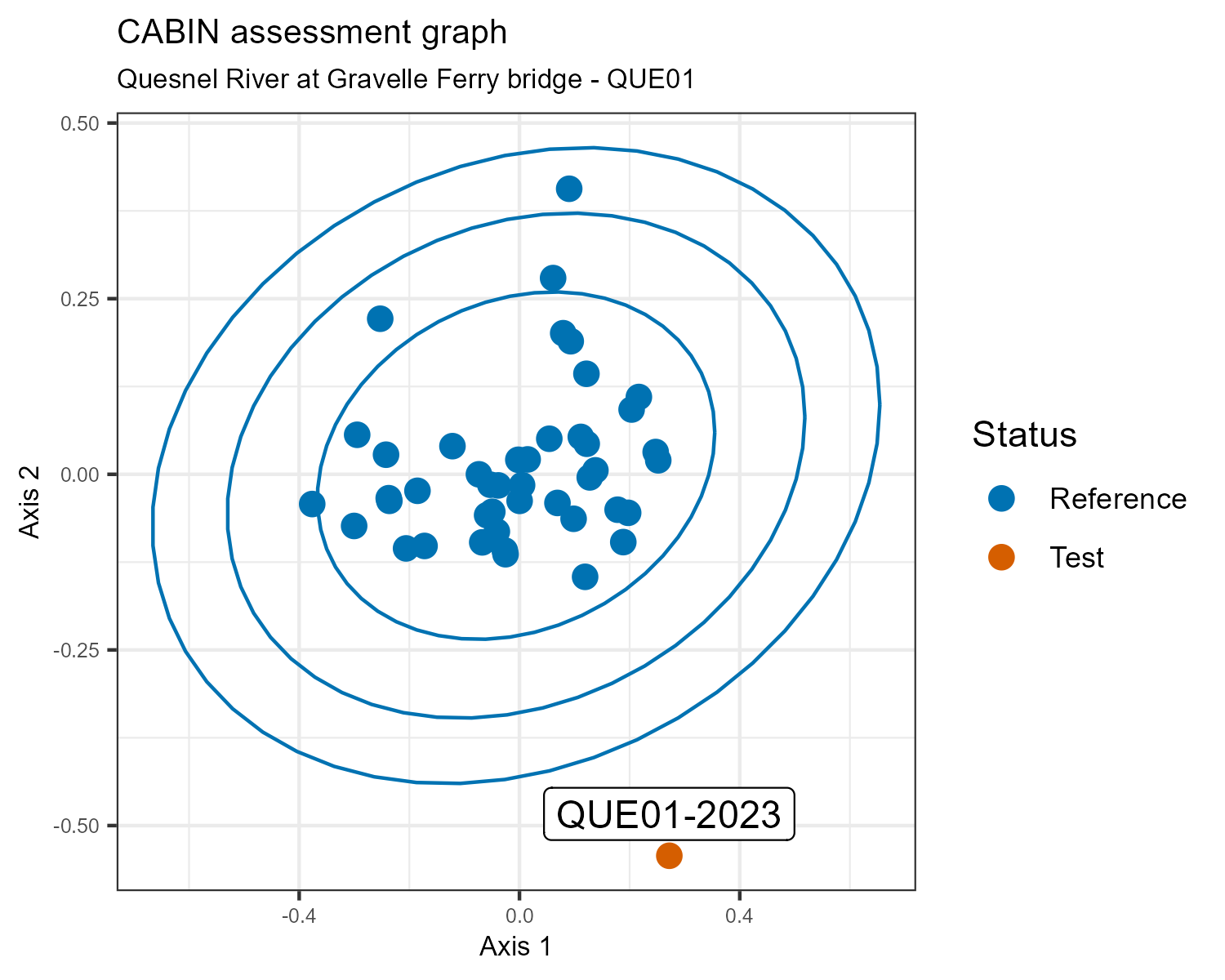 A CABIN assessment considers this water quality monitoring station the “test” site, and compares it to a group of sites with similar habitat features from the Fraser Basin 2021 CABIN reference model. Sites in the reference model have little or no human activity in their watersheds, so they are considered to represent pristine or best possible biological conditions. If the test site is close to the reference sites on the plot, it is also considered to be in good biological condition.