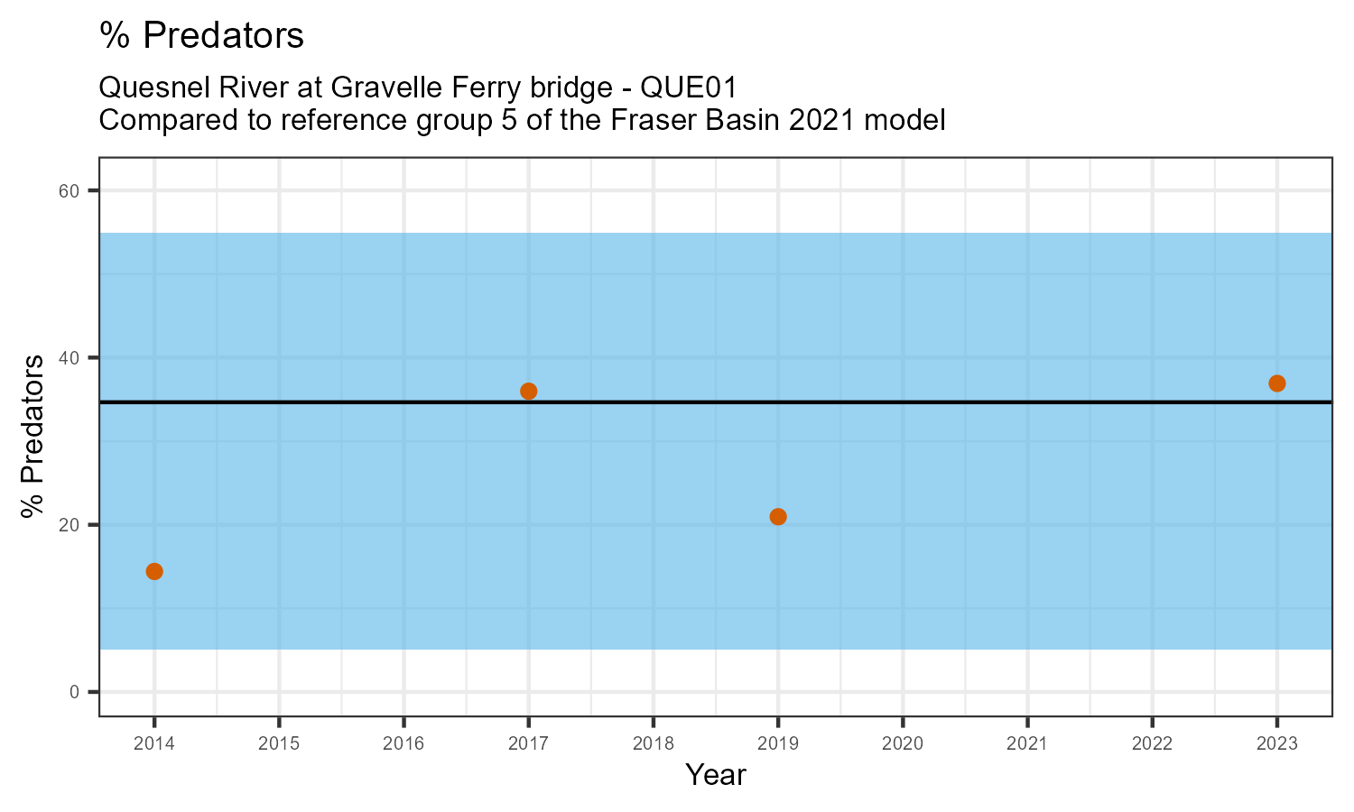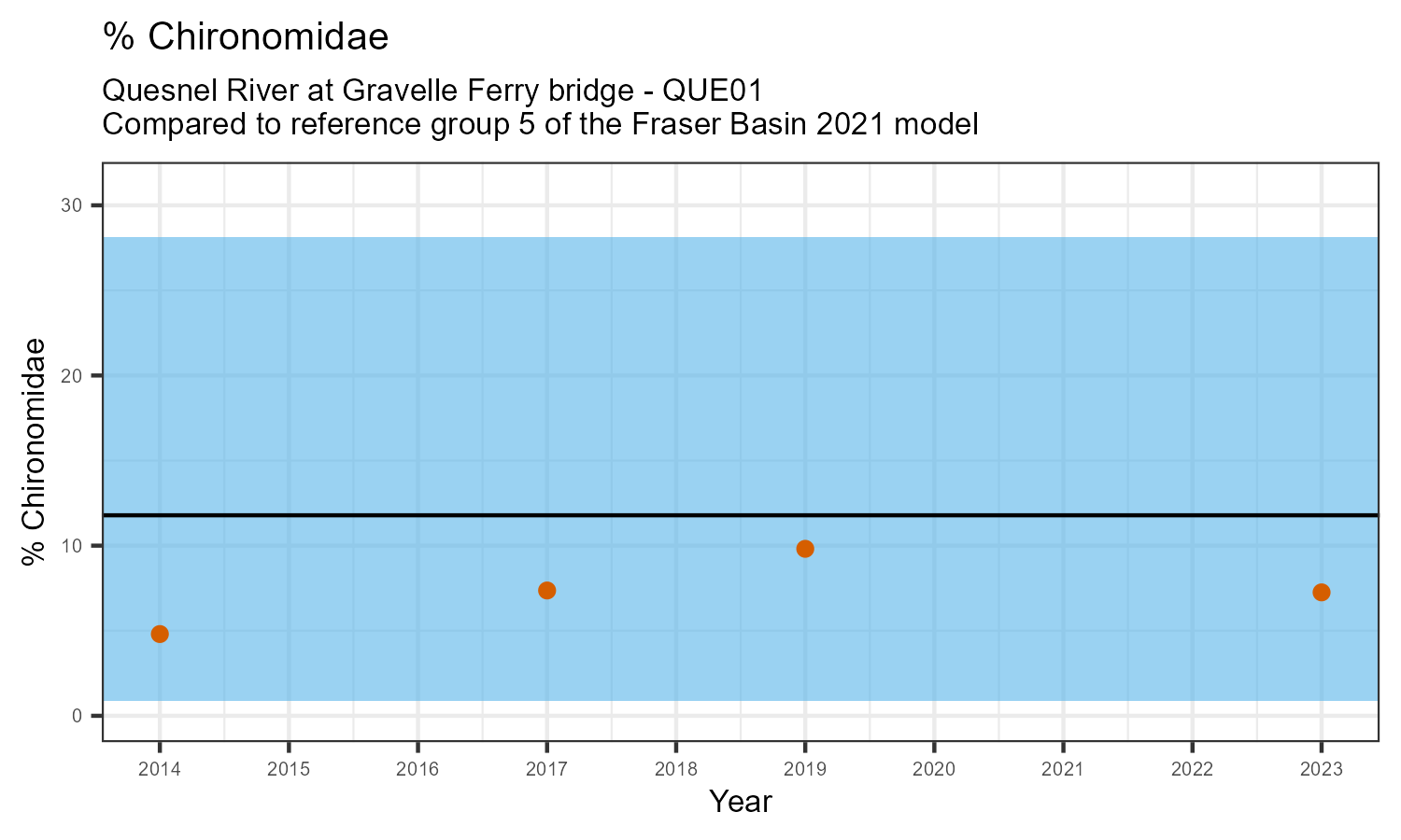 For each metric shown in the graph, the value at this station has been standarized by the standard deviation of the values from the relevant reference model group (in this case, Group 5 of the Fraser Basin 2021 reference model). The black line represents the mean value for that metric in the reference group. The blue bar represents two standard deviations of the reference group above and below the mean.