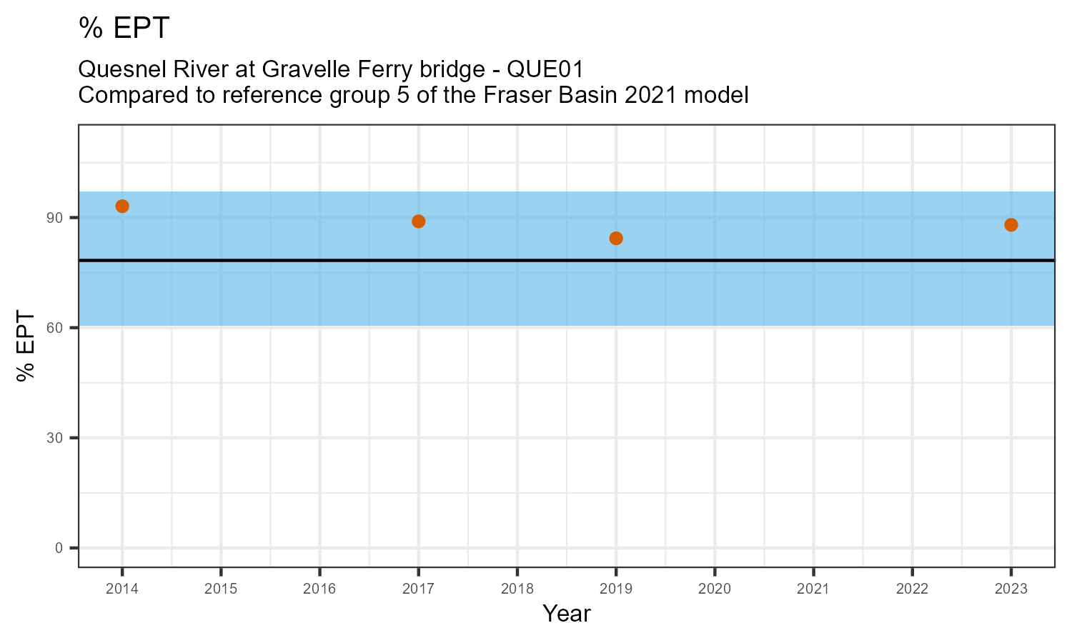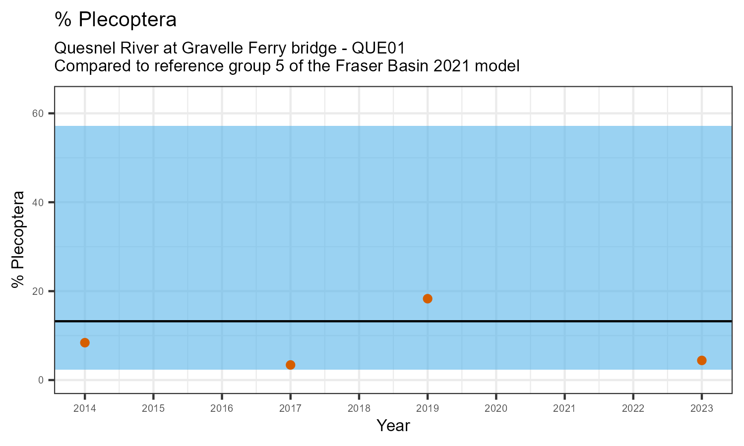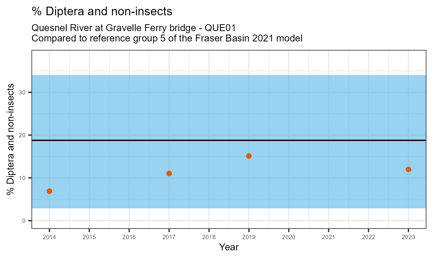 The biological condition at this station was assessed for 2023, the most recent year of sampling. The benthic macroinvertebrate community was analysed by comparing it to similar sites in a CABIN reference model for the Fraser River basin.