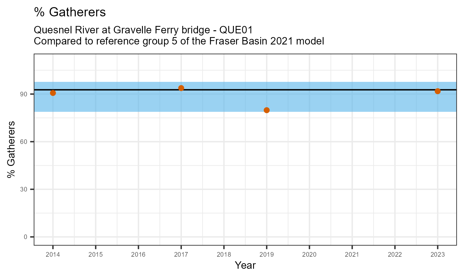 % Gatherers is the proportion of taxonomic familes present that feed primarily on fine organic matter in the water. The proportion of gatherers is expected to increase at a site in response to disturbance.