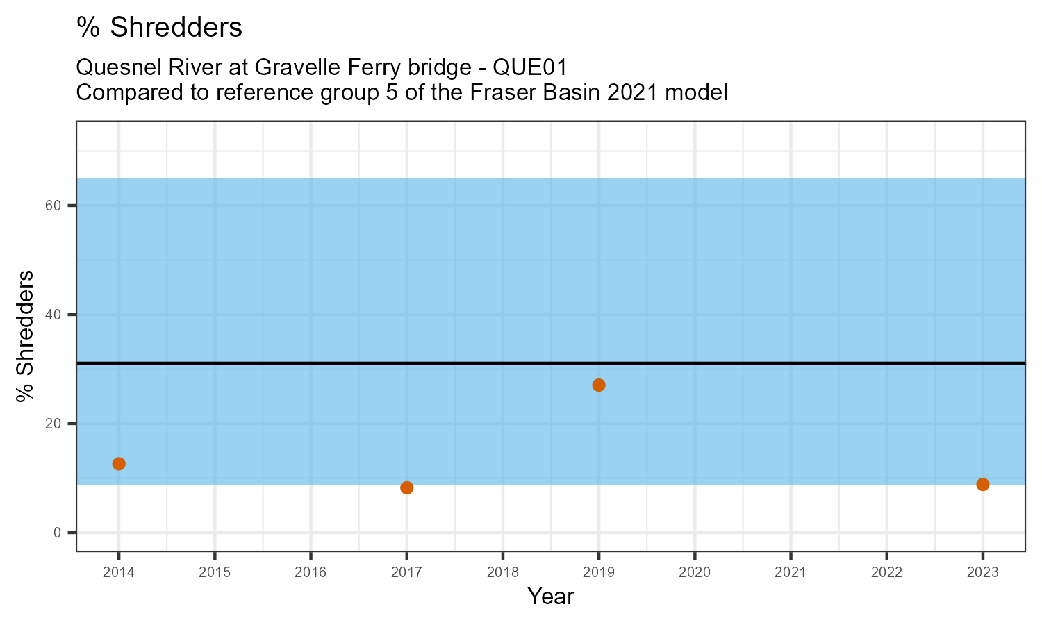 % Shredders is the proportion of taxonomic familes present that feed on leaf litter and other coarse particulate organic matter in the water. The proportion of shredders is expected to decrease at a site in response to disturbance.