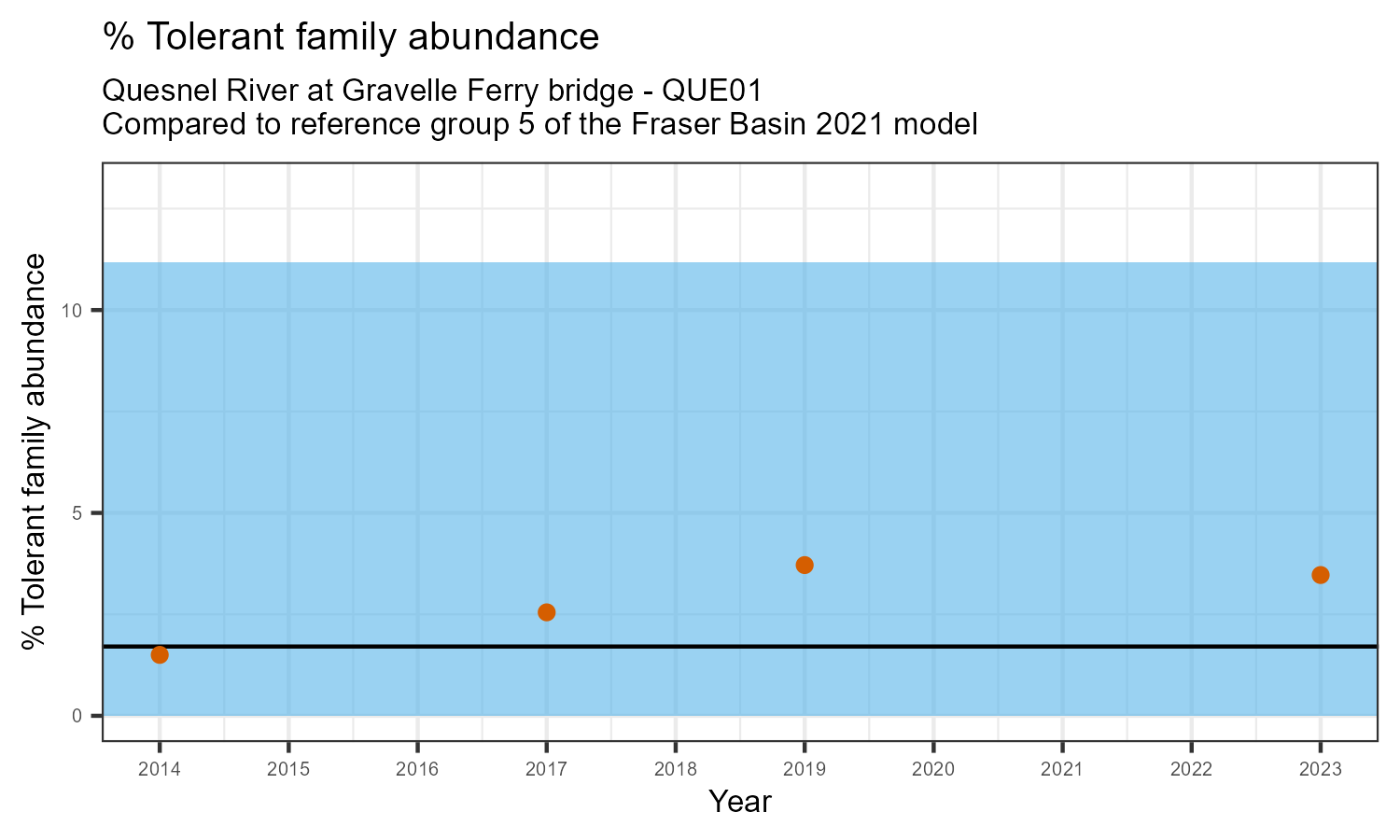 % Tolerant family abundance is the proportion of taxonomic families that are tolerant to pollution, according to the Hilsenhoff Biotic Index. The % tolerant family abundance may increase as water pollution increases.