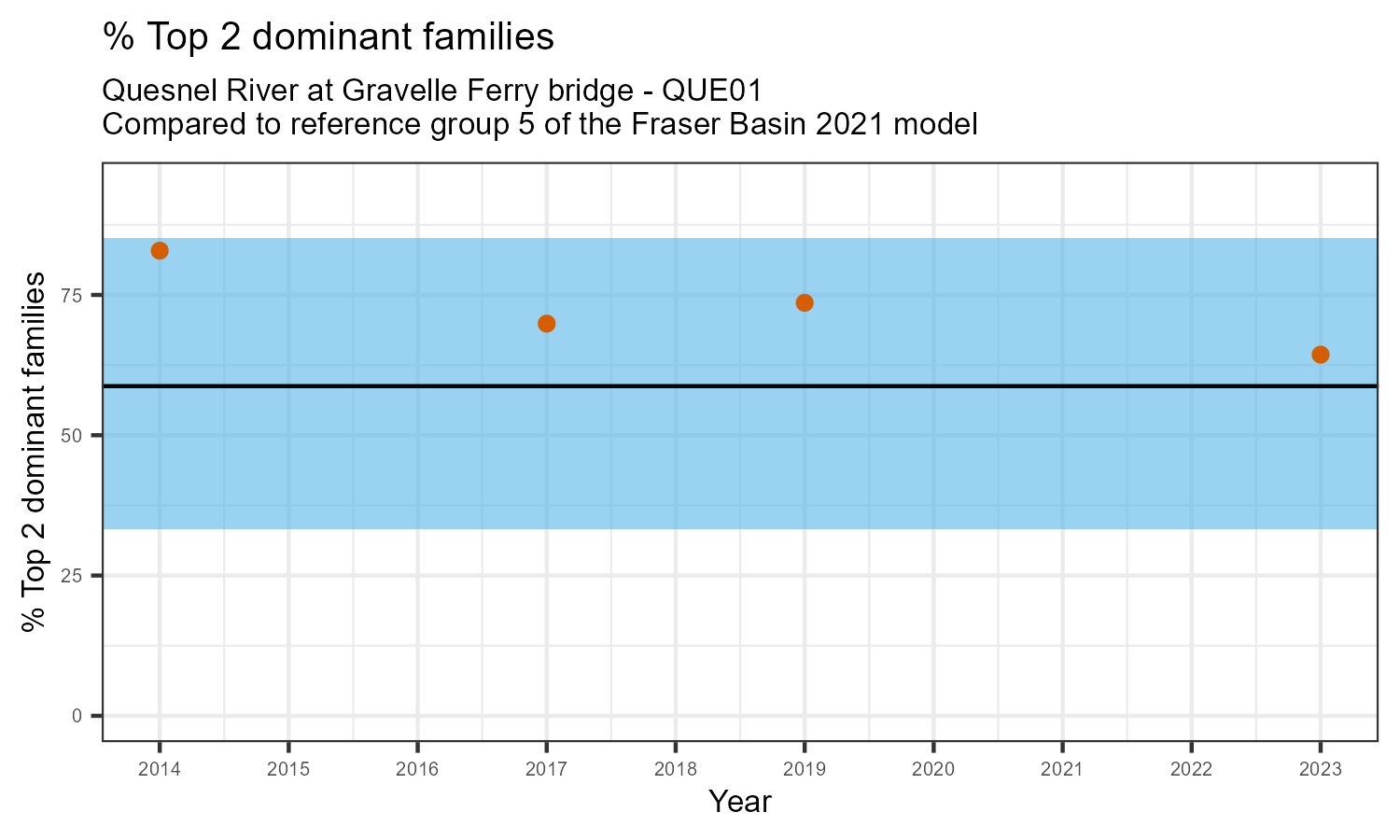 % Top 2 dominant families is the proportion of the total sample represented by the two most abundant families of invertebrates. A healthy aquatic community should have a balance of many types of invertebrates. If only one or two families dominate the community, this can be a sign of habitat disturbance. The percentage of the two most dominant families in the community may increase in response to disturbance.