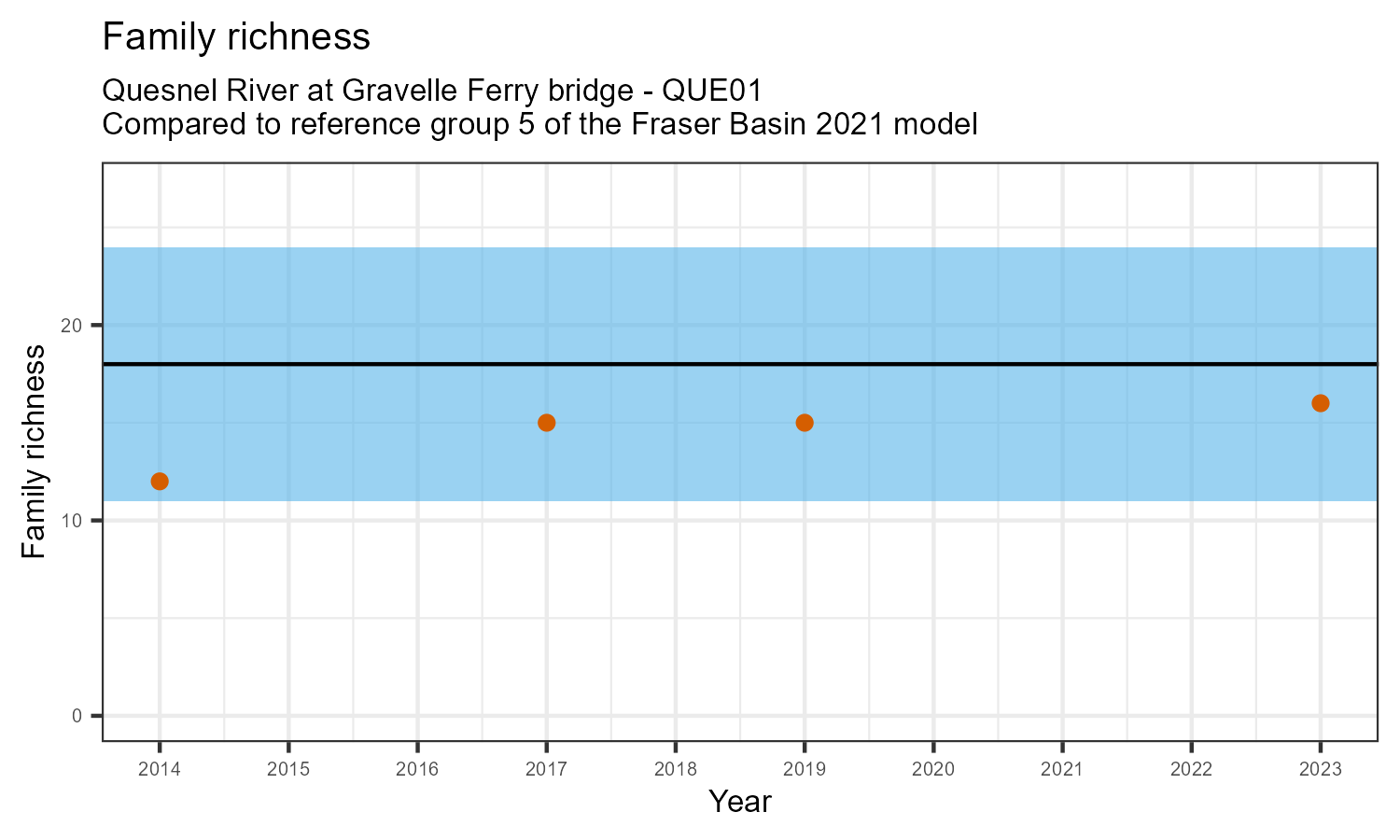 Family richness is the total number of taxonomic families identified. Family richness can decline in response to habitat disturbances or introduction of invasive species.