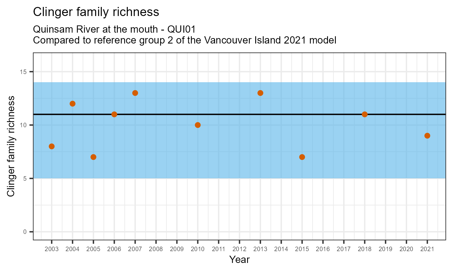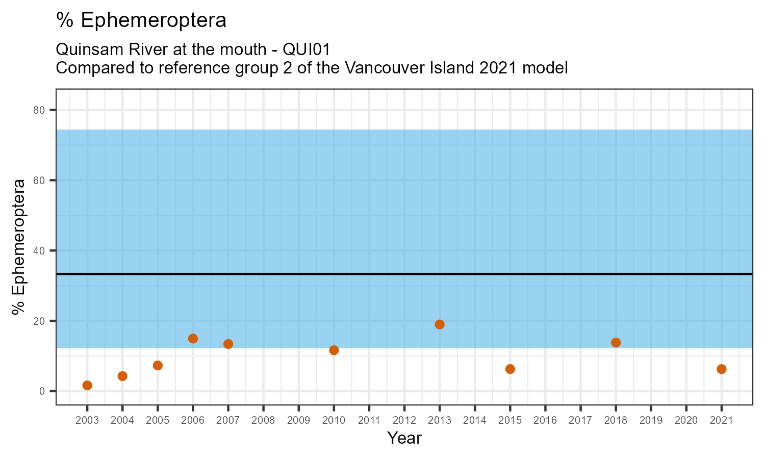 The biological condition at this station was assessed for 2021, the most recent year of sampling. The benthic macroinvertebrate community was analysed by comparing it to similar sites in a CABIN reference model for the Vancouver Island region.