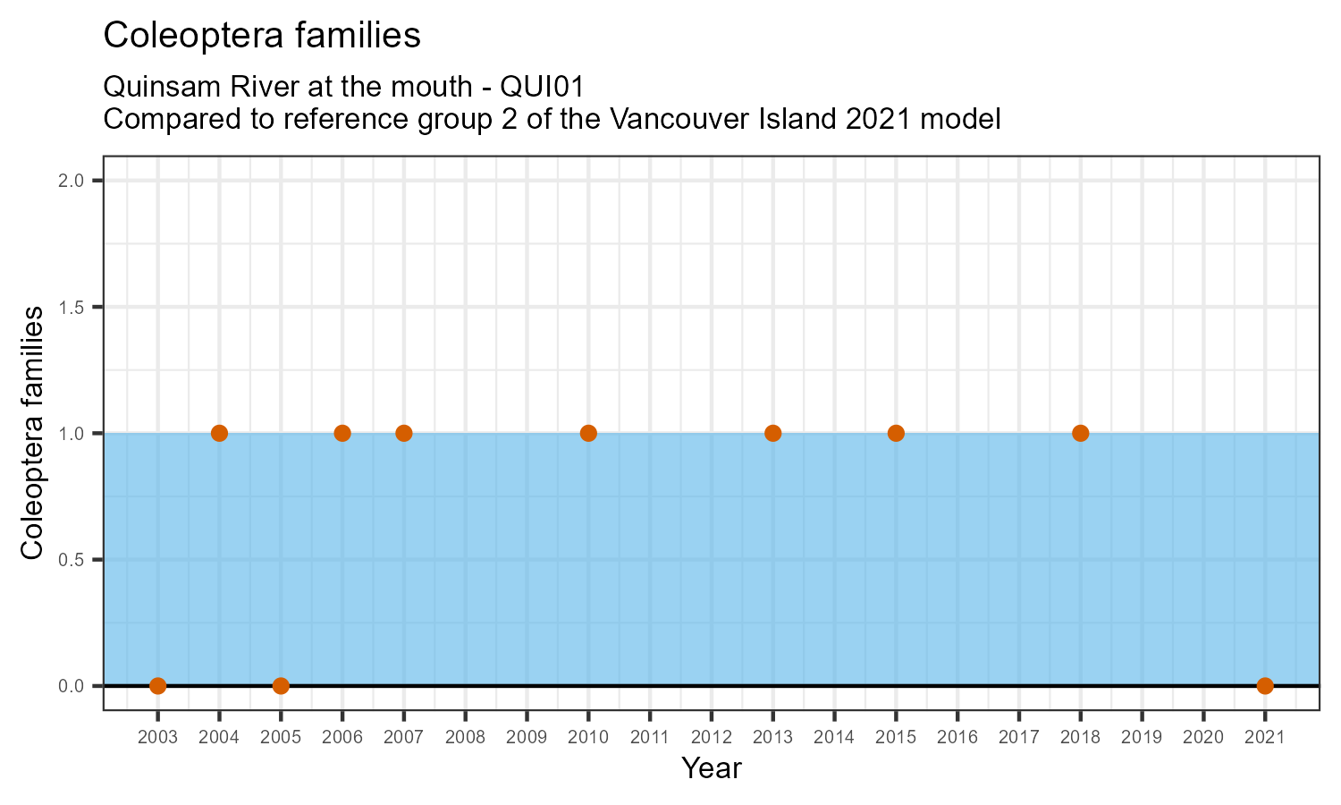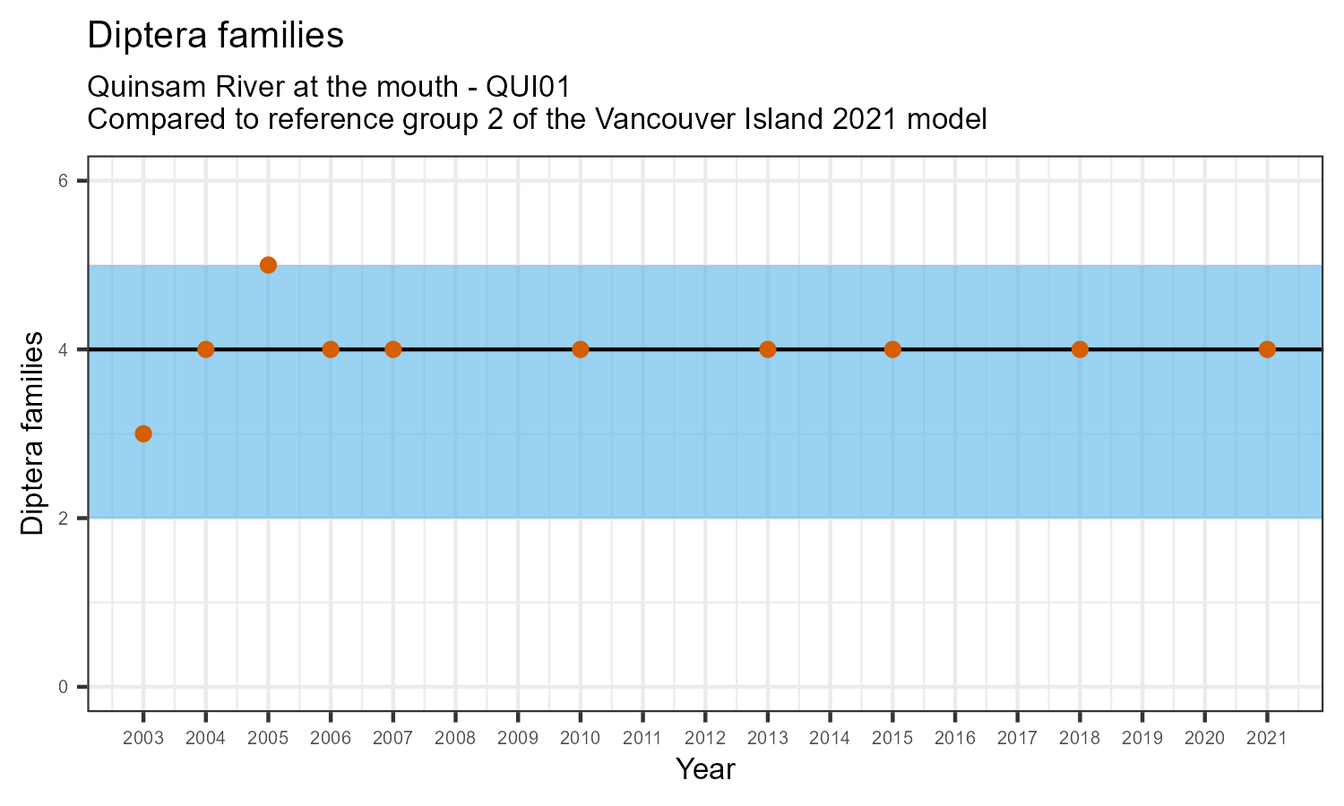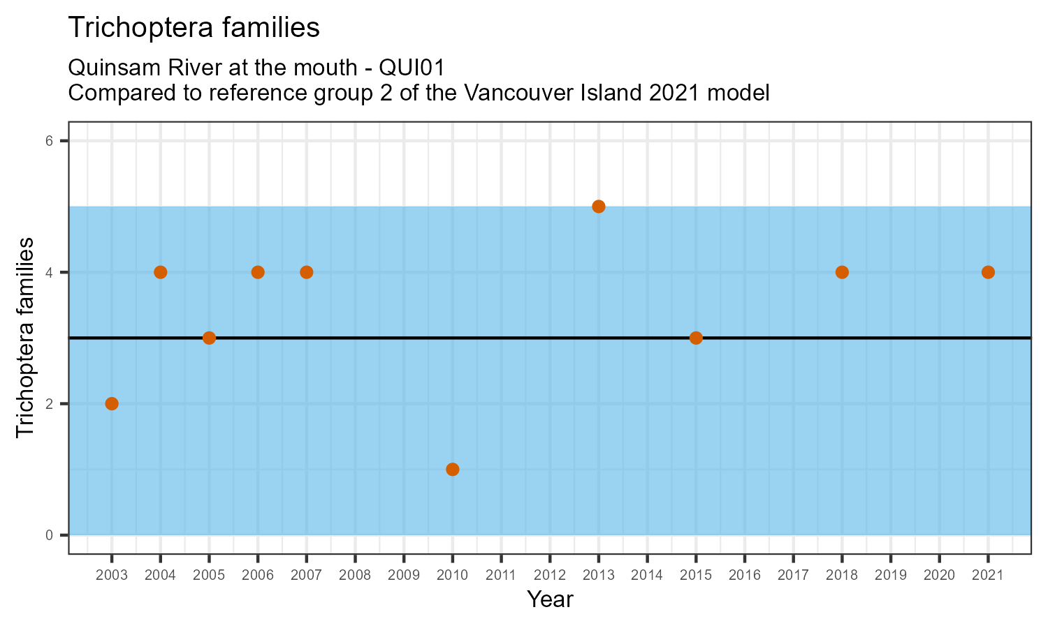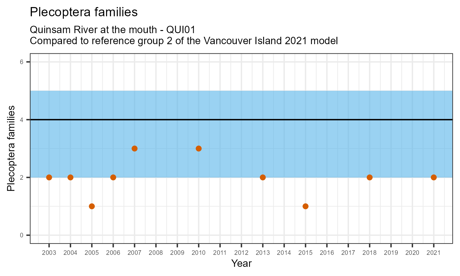 The number of families observed at this station was divided by the number of families found at more than half of similar reference sites. In 2021 the O:E ratio for this station was 0.97.