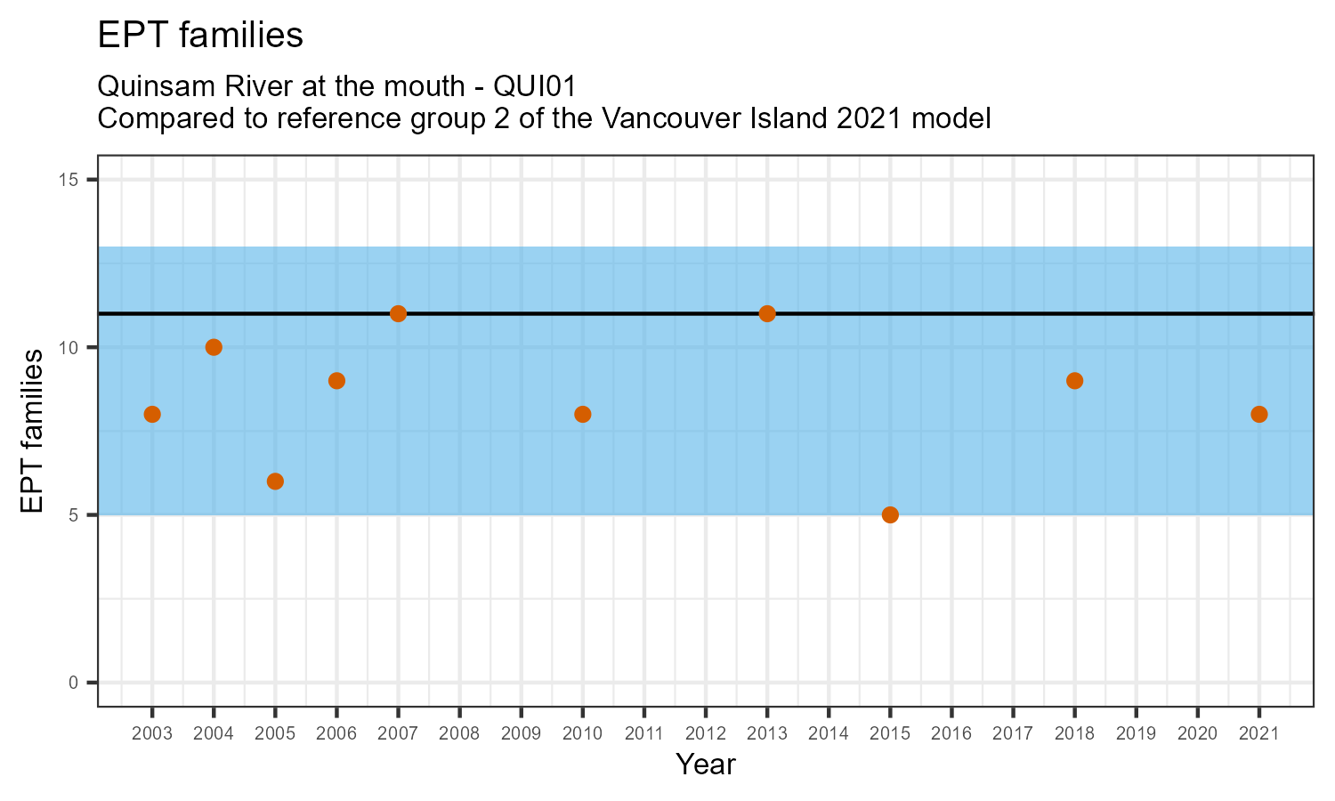 EPT family richness is measured by counting how many taxonomic families belong to one of the pollution sensitive EPT orders: Ephemeroptera (mayflies), Plecoptera (stoneflies), or Trichoptera (caddisflies). EPT family richness may decrease in response to habitat disturbances like poor water quality.