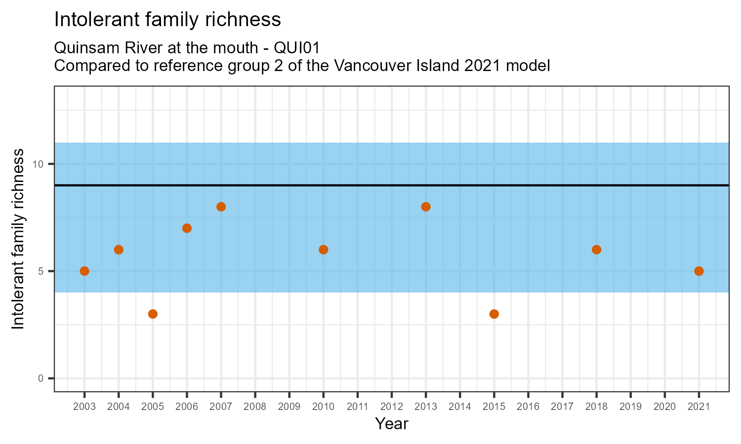 Intolerant family richness counts the number of taxonomic families that are sensitive (intolerant) to pollution, according to the Hilsenhoff Biotic Index. Intolerant family richness may decrease as water pollution increases.