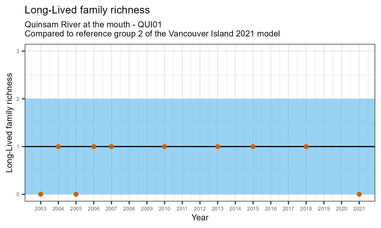 Long-lived family richness counts the number of taxonomic families that need more than 1 year to complete their life cycle. These families have been exposed to conditions in the water over a longer period. They provide information on historical and current water quality conditions. The number of long-lived families may decrease in response to habitat disturbances like poor water quality.