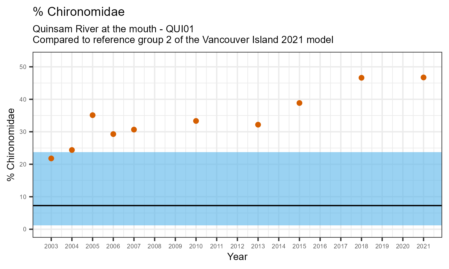 % Chironomidae is the proportion of invertebrates that belong to the taxonomic family Chironomidae. Chironomidae are non-biting midges and are often the most abundant family in a stream. Their pollution tolerance varies widely between different species.