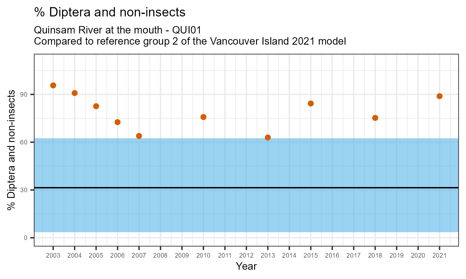 % Diptera and non-insects is the proportion of invertebrates that either are not insects, or are insects in the taxonomic order Diptera. Diptera are flies, and along with non-insects they represent the more pollution tolerant members of the aquatic community. The % Diptera and non-insects may increase in response to habitat disturbances like poor water quality.
