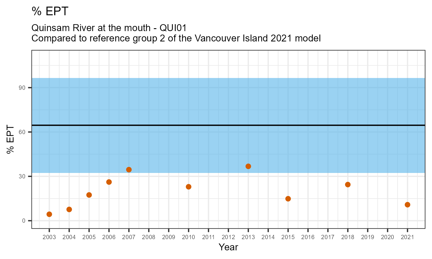 % EPT is the proportion of invertebrates that belong to one of the taxonomic orders of Ephemeroptera (mayflies), Plecoptera (stoneflies), or Trichoptera (caddisflies). These types of insects are often grouped together under the term “EPT”. They are typically the most sensitive to habitat disturbances like poor water quality.
