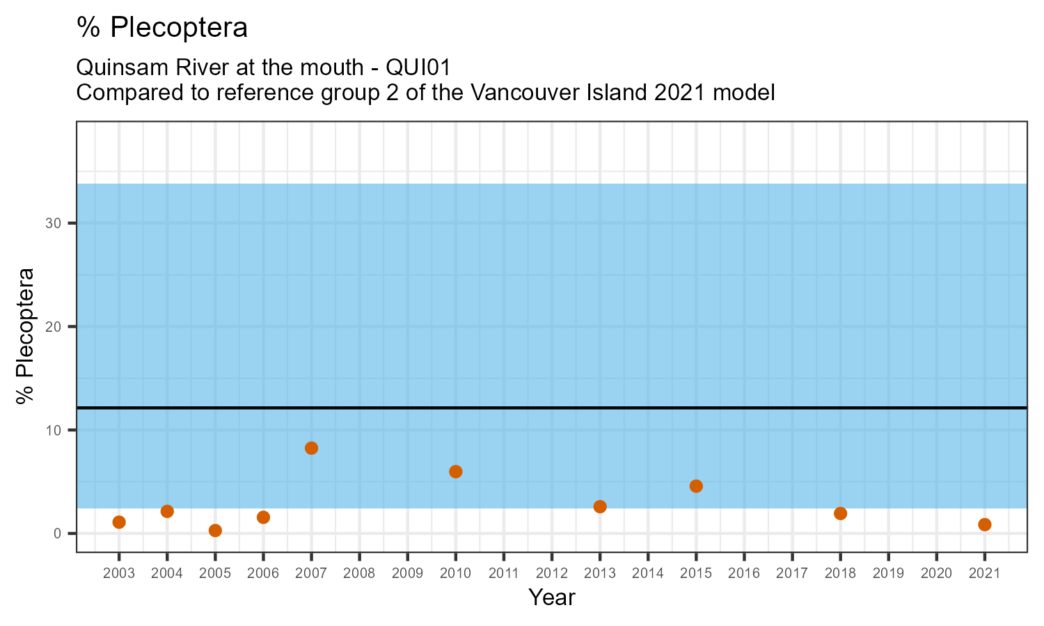% Plecoptera is the proportion of invertebrates that belong to the taxonomic order Plecoptera. Plecoptera are commonly called stoneflies. They are sensitive to pollution. The % Plecoptera may decrease in response to habitat disturbances like poor water quality.