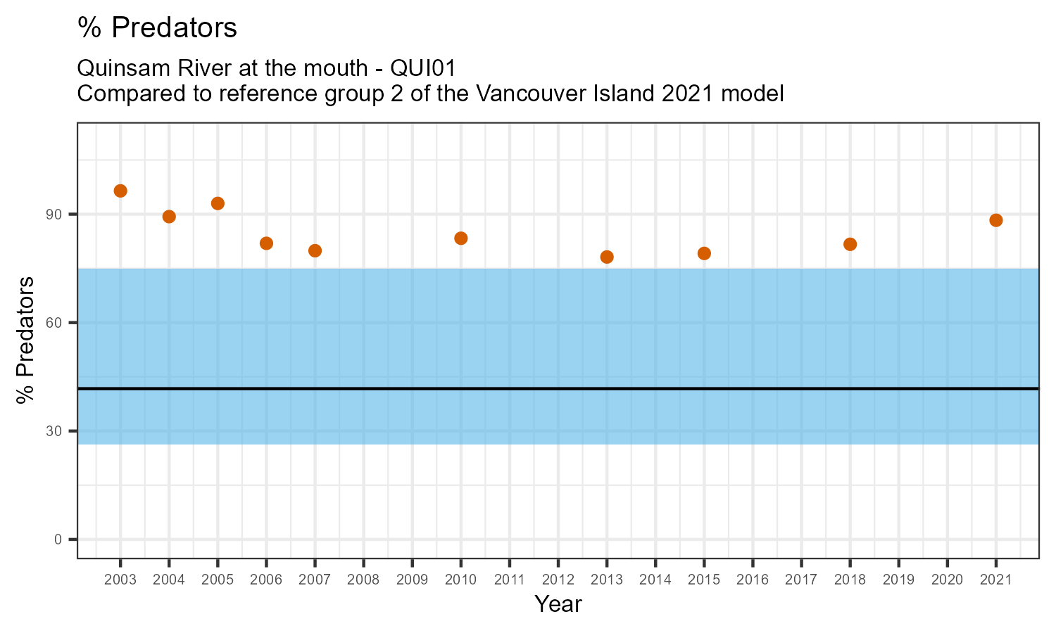 % Predators is the proportion of taxonomic familes present that feed primarily on other organisms. The proportion of predators is expected to decline at a site in response to disturbance.