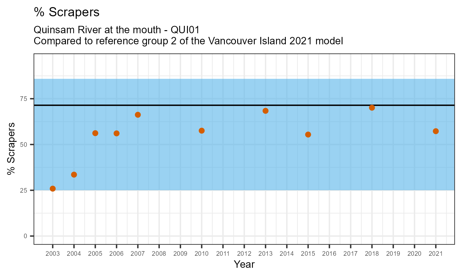 % Scrapers is the proportion of taxonomic familes present that feed by grazing on the algae growing on rocks and other underwater surfaces. The proportion of scrapers is expected to decrease at a site in response to disturbance.
