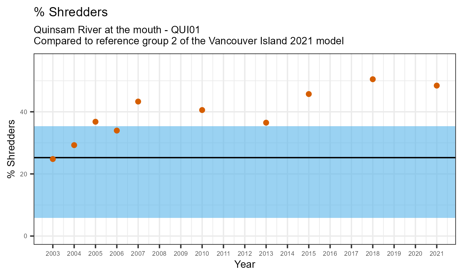 % Shredders is the proportion of taxonomic familes present that feed on leaf litter and other coarse particulate organic matter in the water. The proportion of shredders is expected to decrease at a site in response to disturbance.