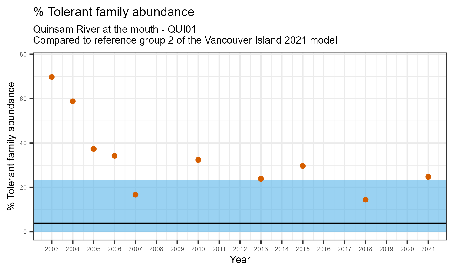% Tolerant family abundance is the proportion of taxonomic families that are tolerant to pollution, according to the Hilsenhoff Biotic Index. The % tolerant family abundance may increase as water pollution increases.