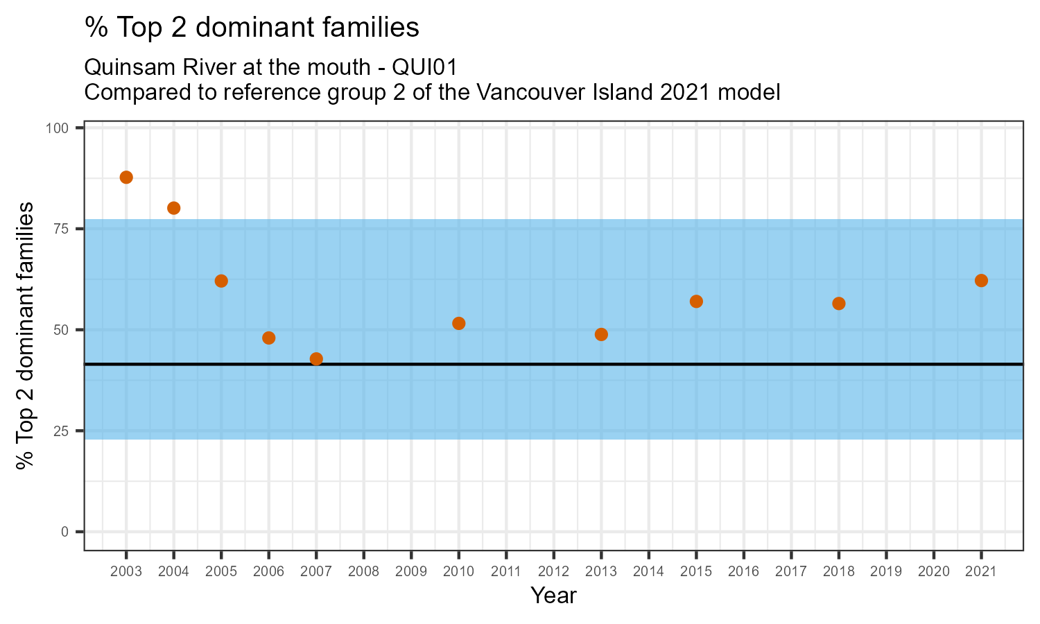 % Top 2 dominant families is the proportion of the total sample represented by the two most abundant families of invertebrates. A healthy aquatic community should have a balance of many types of invertebrates. If only one or two families dominate the community, this can be a sign of habitat disturbance. The percentage of the two most dominant families in the community may increase in response to disturbance.