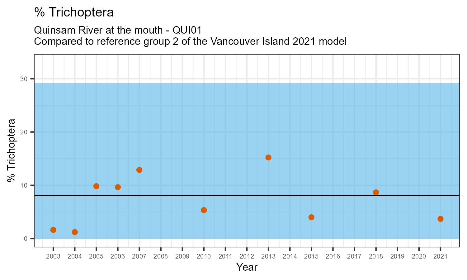 % Trichoptera is the proportion of invertebrates that belong to the taxonomic order Trichoptera. Trichoptera are commonly called caddisflies. They are sensitive to pollution. The % Trichoptera may decrease in response to habitat disturbances like poor water quality.