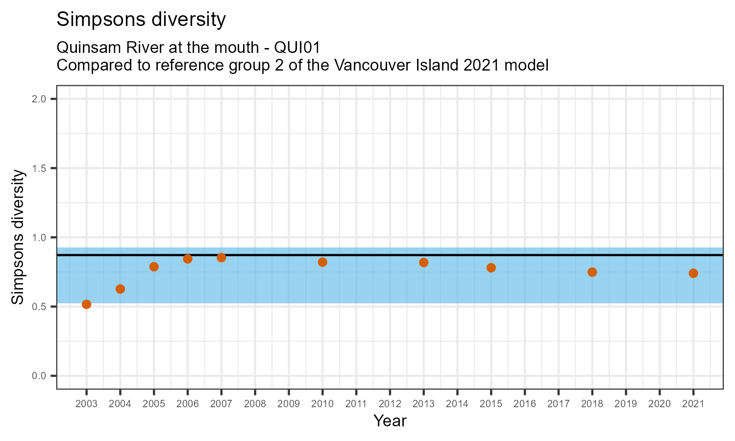 This graph shows individual metric values at this station compared to the reference group it classified to most often over all years of sampling. In this case, that is Group 2 of the Vancouver Island 2021 reference model.