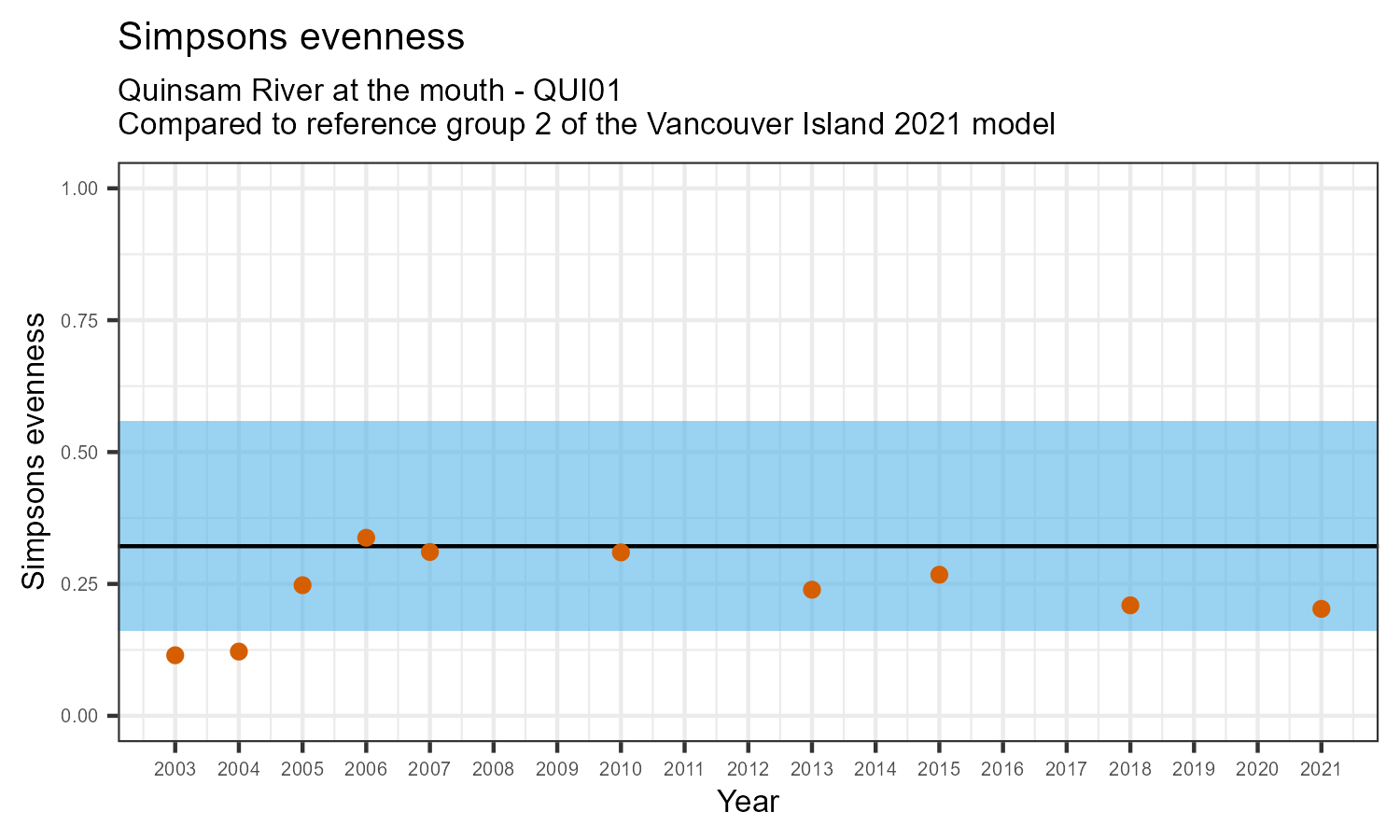 Simpson’s evenness is an index that measures whether the number of individuals in various taxonomic families is similar, or balanced. Balanced communities are an indicator of a healthy ecosystem. Simpson’s evenness may decrease in response to habitat disturbances.