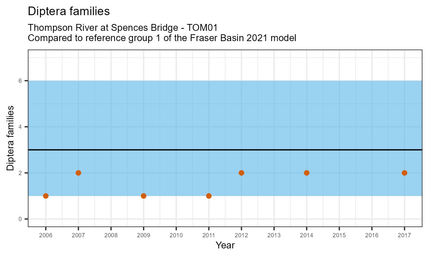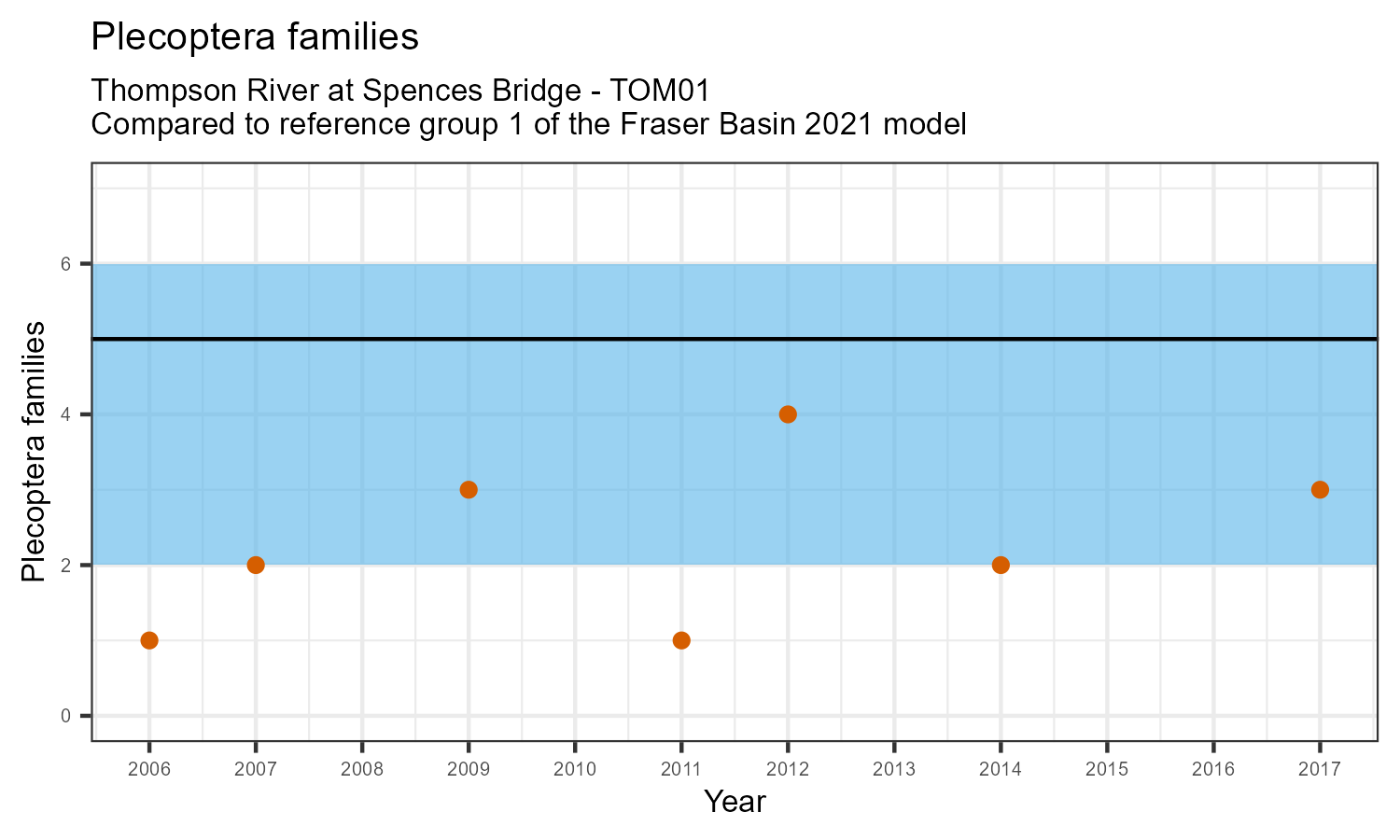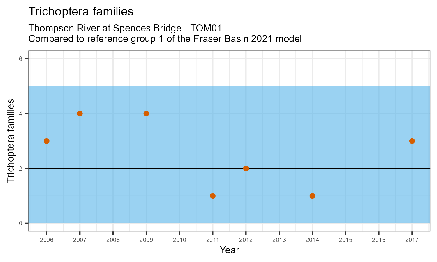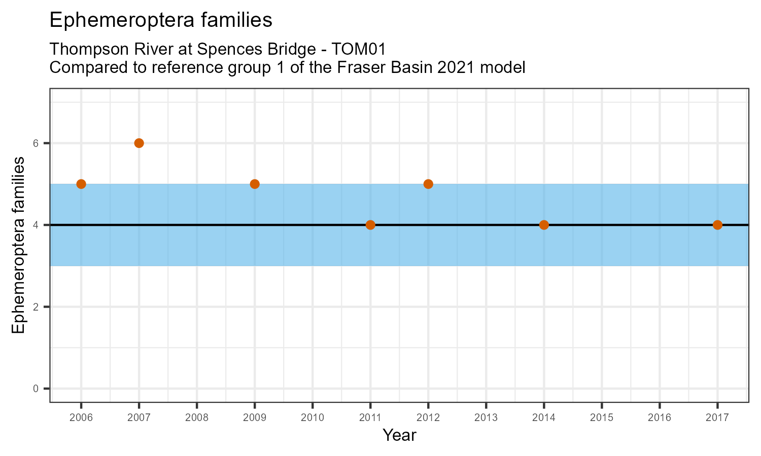 The number of families observed at this station was divided by the number of families found at more than half of similar reference sites. In 2017 the O:E ratio for this station was 0.88.