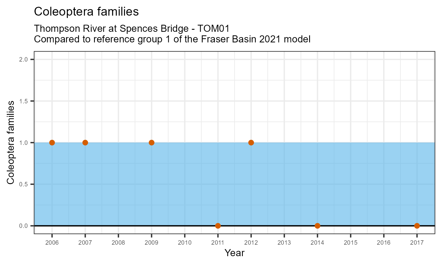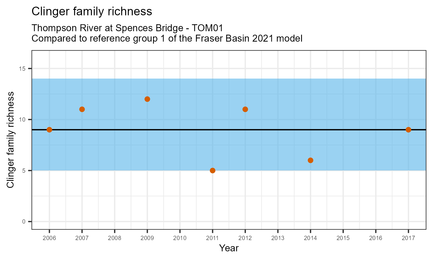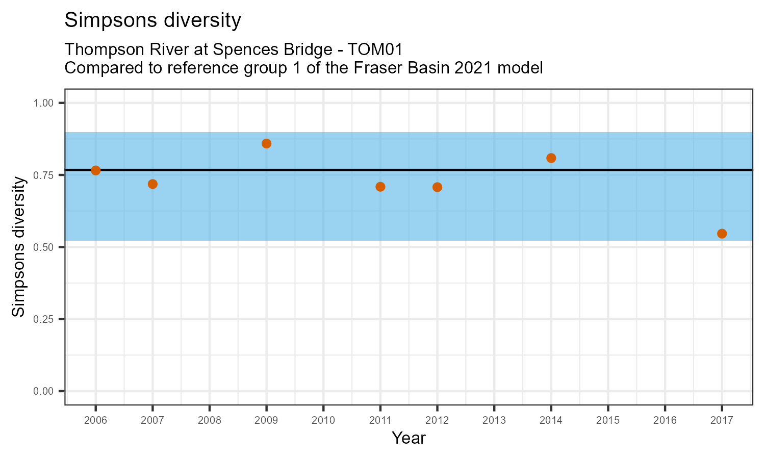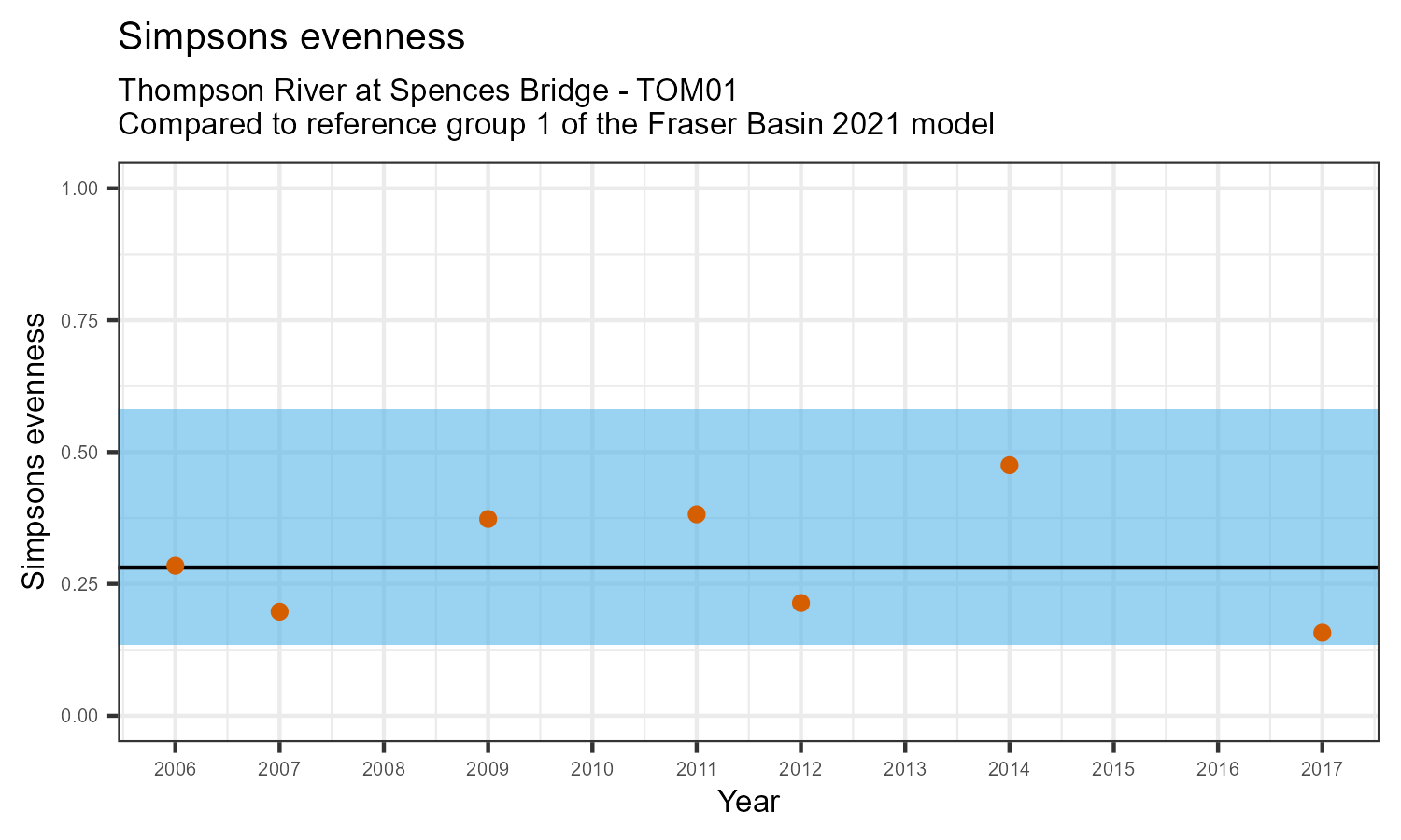 The number of families observed at this station was divided by the number of families found at more than half of similar reference sites. In 2017 the O:E ratio for this station was 0.88.