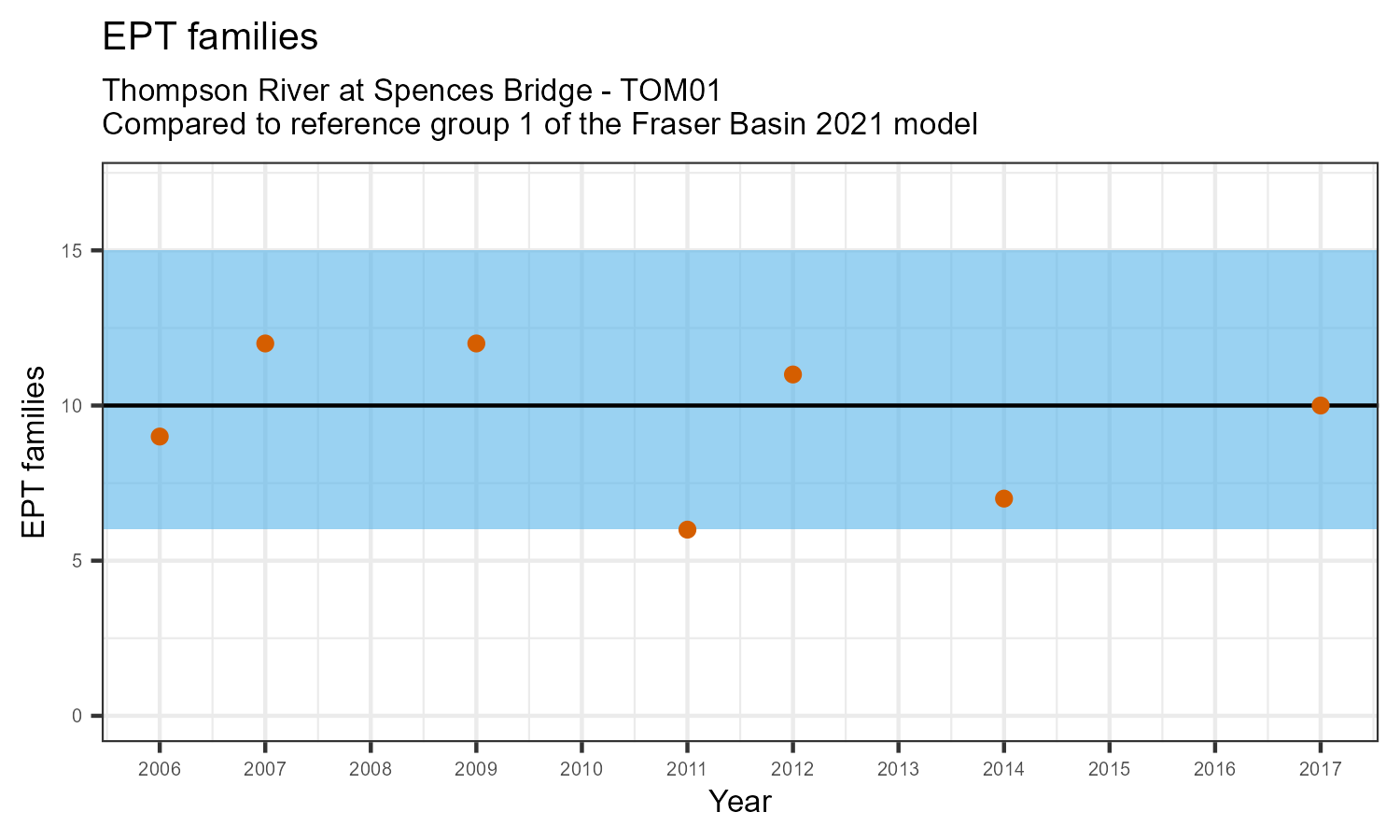 EPT family richness is measured by counting how many taxonomic families belong to one of the pollution sensitive EPT orders: Ephemeroptera (mayflies), Plecoptera (stoneflies), or Trichoptera (caddisflies). EPT family richness may decrease in response to habitat disturbances like poor water quality.